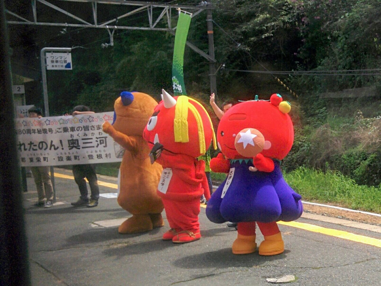 ホーム上で、ご当地キャラクターや地元の方々がお見送り。《第6水窪川橋梁》