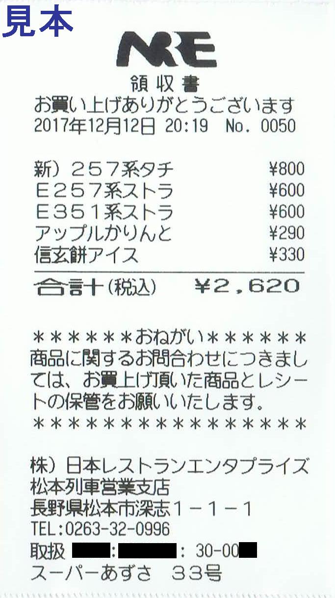 《NRE松本列車営業支店発行 スーパーあずさ33号領収書(2017年12月12日)》