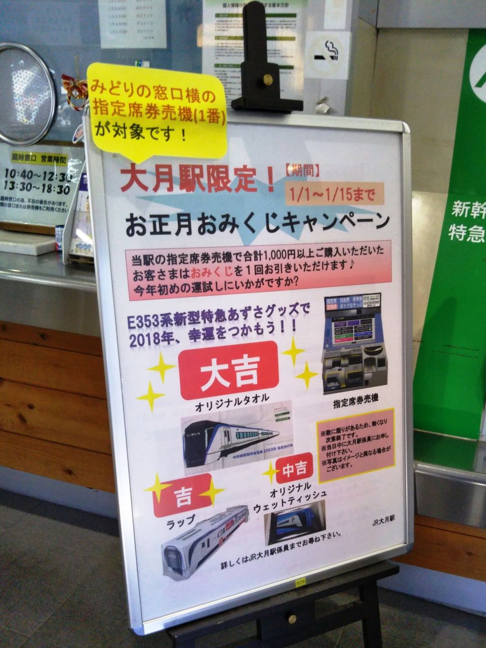 指定席券売機1番の横に掲出されていた『大月駅限定!お正月おみくじキャンペーン』の案内です。《スーパーあずさ1号乗車記・新宿→八王子(2017年12月23日)》