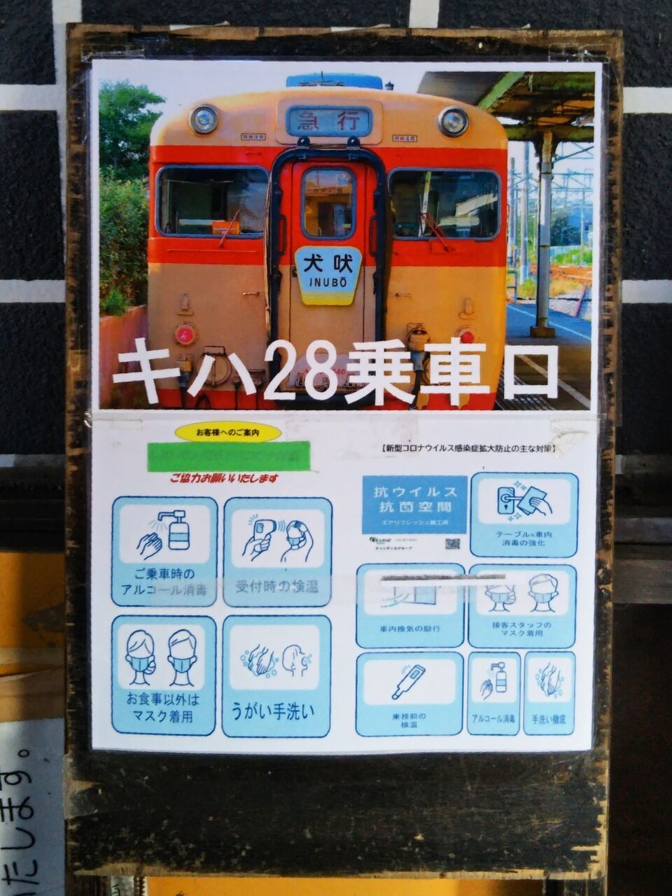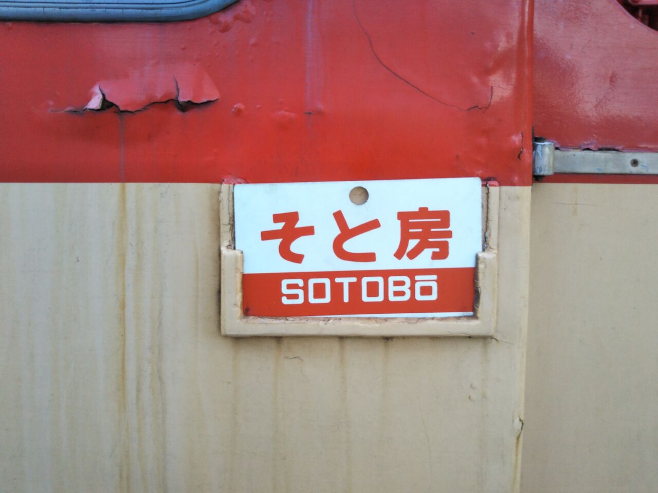 撮影地は大多喜駅です。同駅には定期運行終了前に使用されたと思われるキハ28乗車口の看板が残っていました。