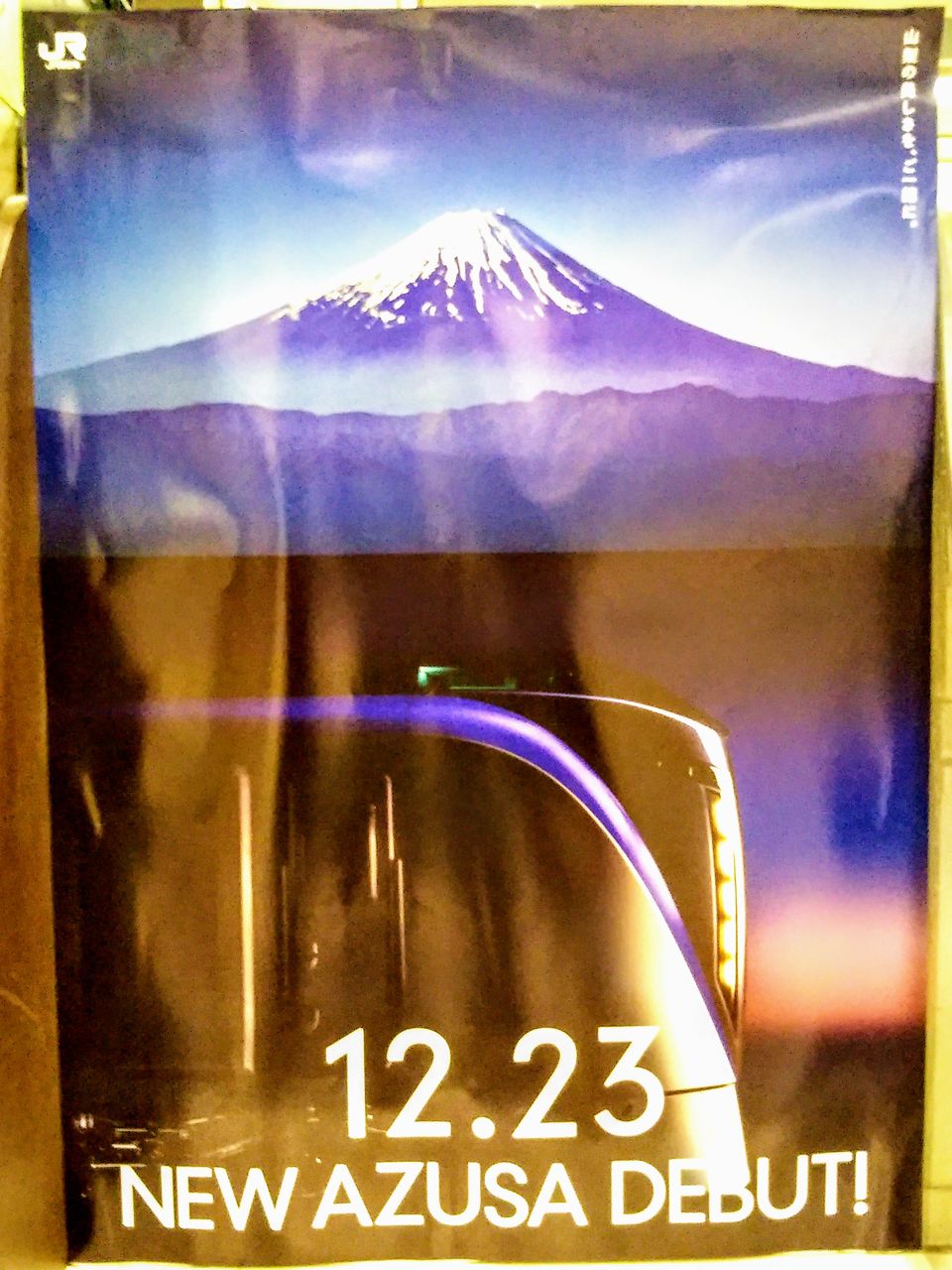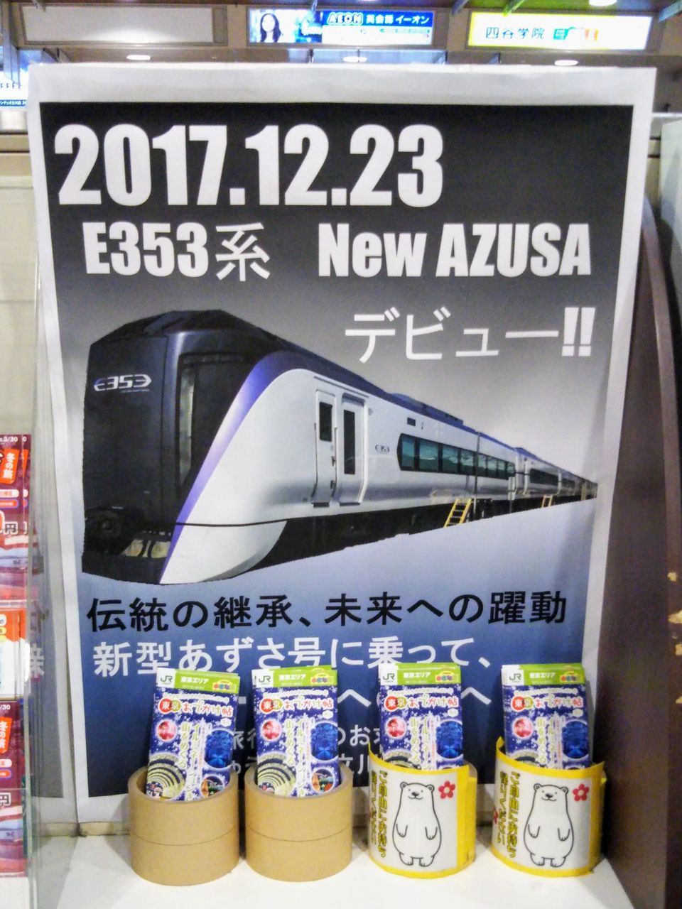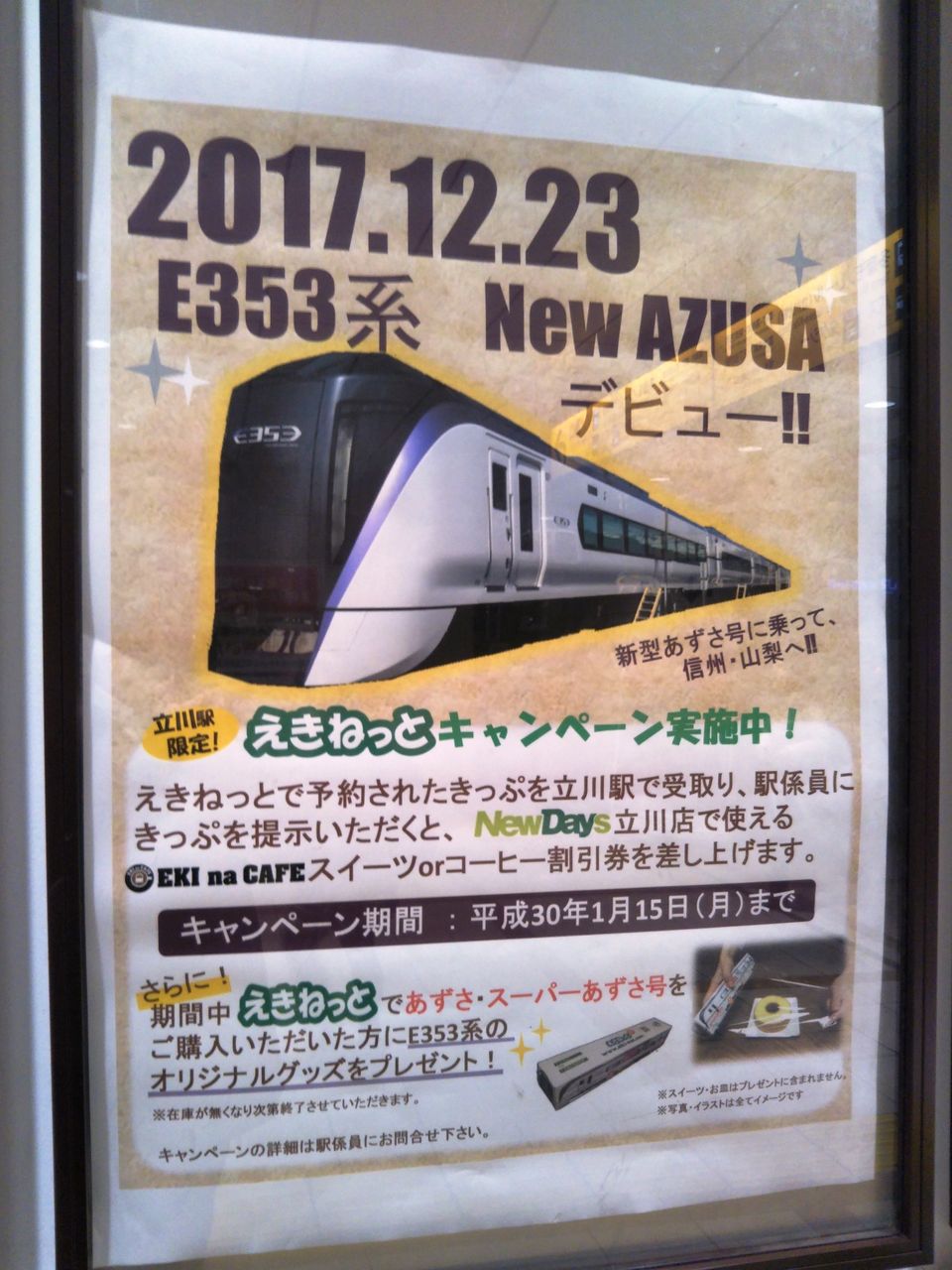 E353系デビューポスター。2017年12月23日撮影。〔立川駅(2017年12月22日撮影)〕