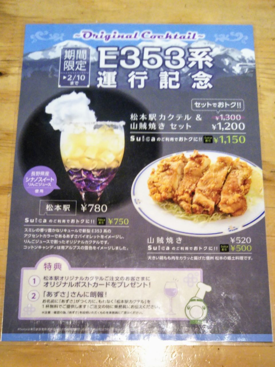 神田駅にある鉄道バー『神田鐵道倶楽部』では、E353系デビューを記念して、カクテル松本駅(税込780円。Suica割引で750円)と山賊焼き(税込520円。Suica割引で500円)を期間限定発売していました。セットでは更に税込1,200円(Suica割引で1,150円)となっていました。