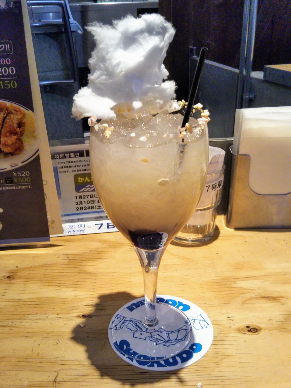 写真左はカクテル・松本駅です。長野県産シナノスイートりんごジュースを使用。雪をイメージしたという綿菓子が載っているのが面白いです。訪問するまで知りませんでしたが、このカクテルを注文すると、写真右の神田鐵道倶楽部オリジナルのE353系ポストカードがプレゼントされました。カクテルとポストカードの写真の雰囲気は似ています。