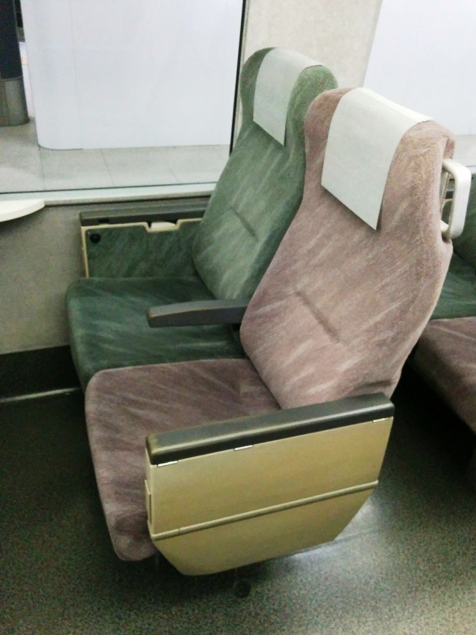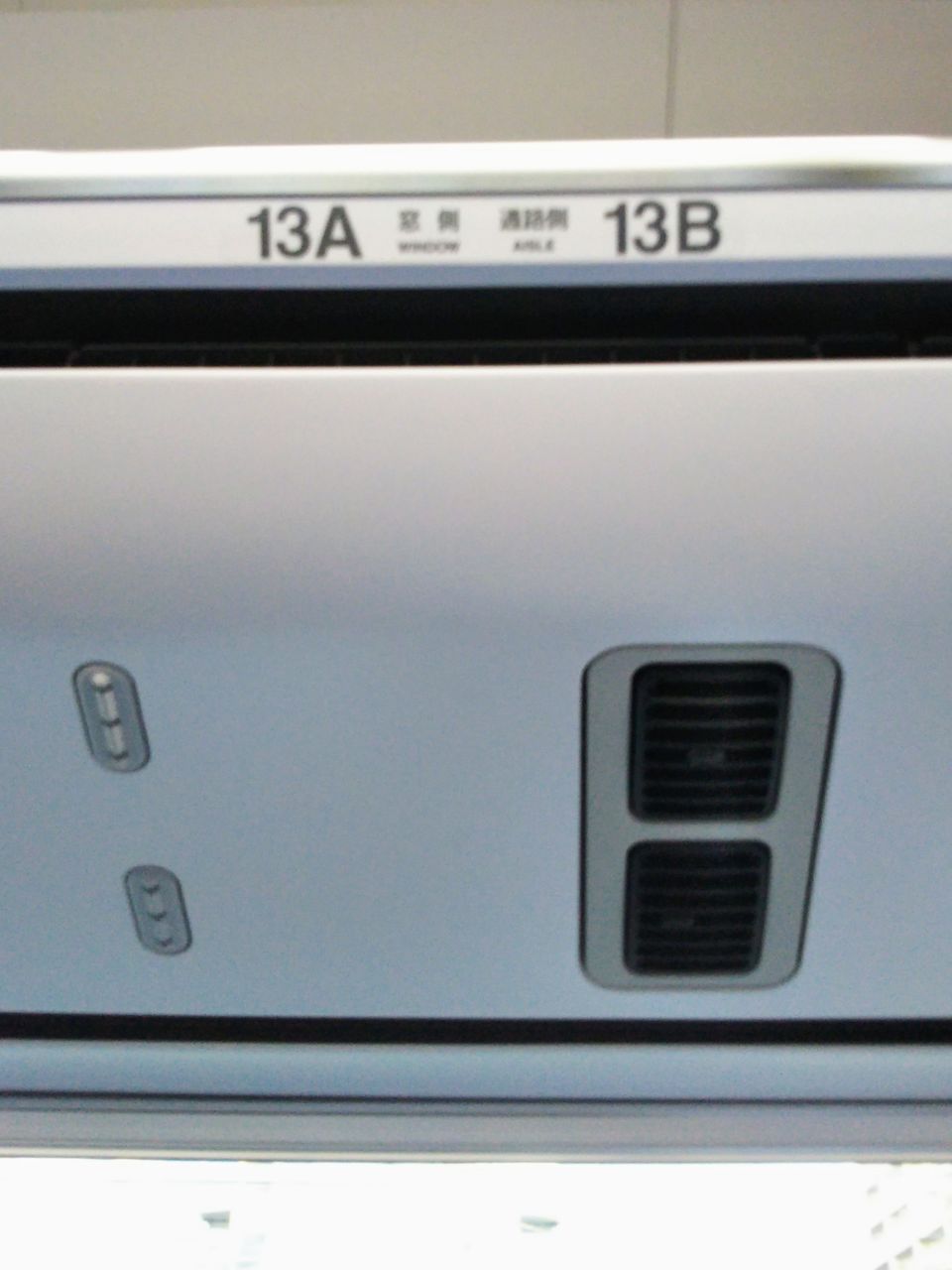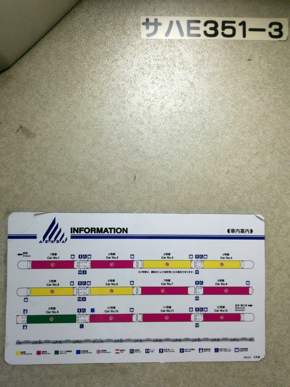 スーパーあずさ1号の普通車指定席車内。写真左は座席。写真右は座席上のランプ。いずれは特急ひたち号、ときわ号の様に全車指定席化されるのでしょう。E353系グッズ専用の車内販売員の方がおり、指定席車両で販売しておられたため、収集活動はスムーズ。