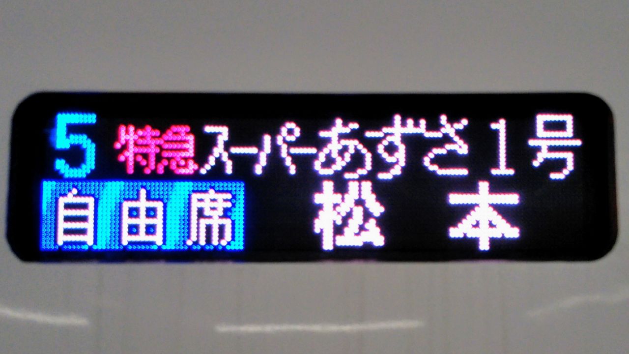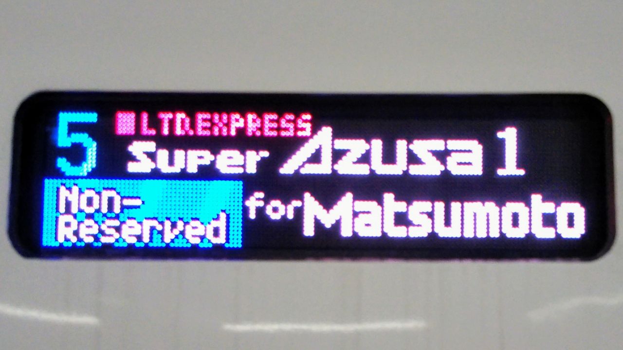 八王子駅に到着したスーパーあずさ1号。撮影者は新宿駅ほどではありませんが、凄い人数です。案内表示には新型であることが表示される様になりました。ここまでの区間は同月12日にもE351系のスーパーあずさ号でも乗車していますが、E353系での乗り心地の良さがよくわかります。