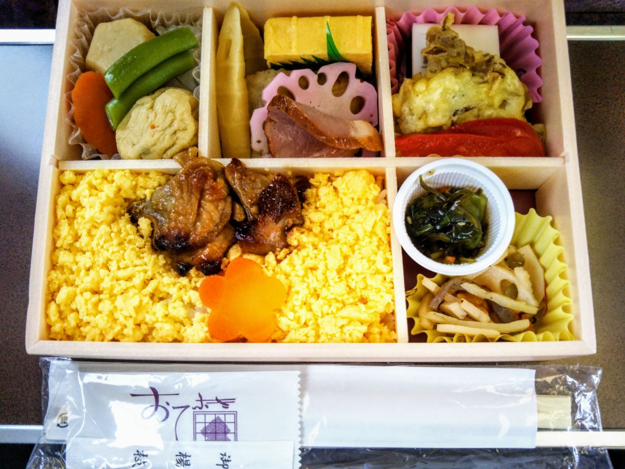 中身はいつも通り。舞茸天ぷらの後ろに隠れていた羊羹には『E351』の文字入り。昆布和えと蓮根梅酢漬が今までのNREの弁当では記憶に無い新しい味。舞茸天ぷらに付ける塩または醤油が欲しかった(調味料は何も付かない)。