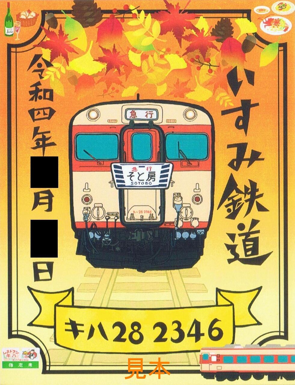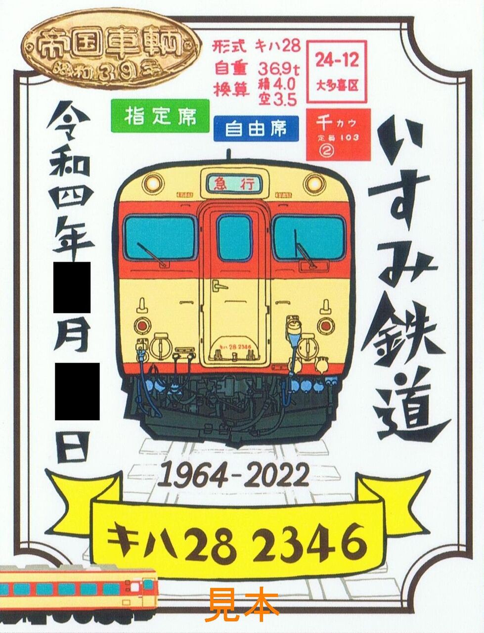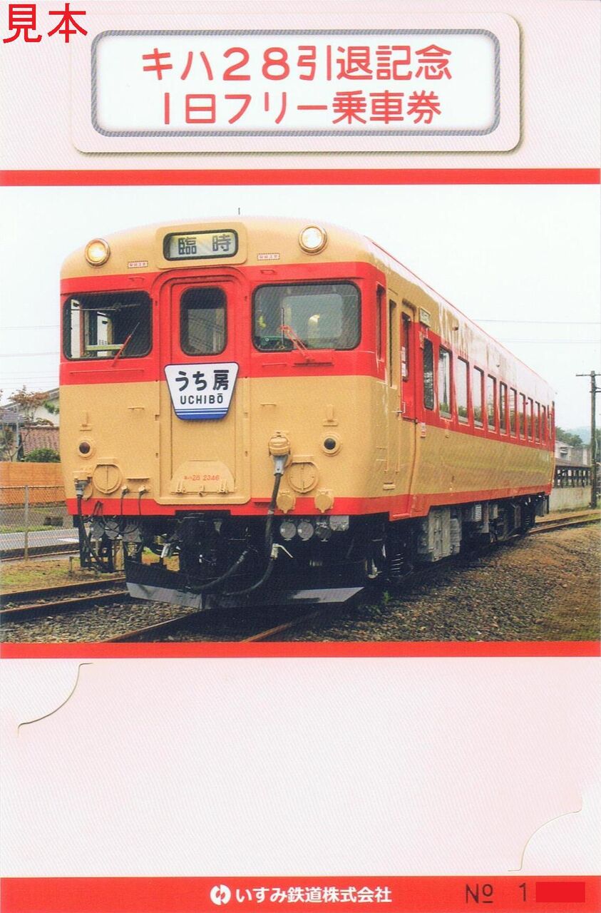 キハ28の定期運行終了を記念して2022年9月1日に発売した記念フリー乗車券の台紙デザインを変えて追加発売したもの。写真は台紙の表面(うち房号ヘッドマーク)と裏面(快速白い砂号ヘッドマーク)です。