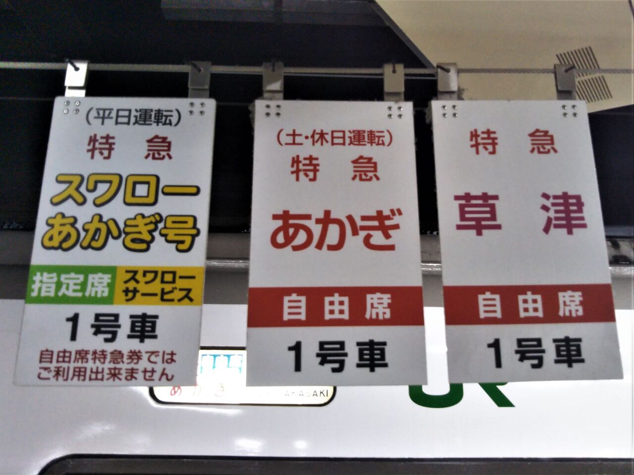 上野駅にある吊り下げ式の特急あかぎ号、草津号、スワローあかぎ号の乗車位置案内板です。※2020年08月21日掲載(特急券、写真)