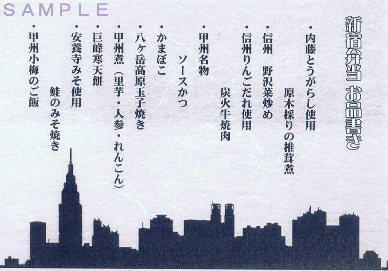 最近の主要駅ご当地駅弁(新宿弁当、上野弁当、大宮弁当)の調製元がNREから各線沿線の駅弁業者に移管されてから初の購入。新宿弁当については先述のヘッドマーク弁当・あずさと同じ丸政。新宿弁当なのに甲信越風の弁当へと変わりましたが味は良いです。《神田鐵道倶楽部(NRE)