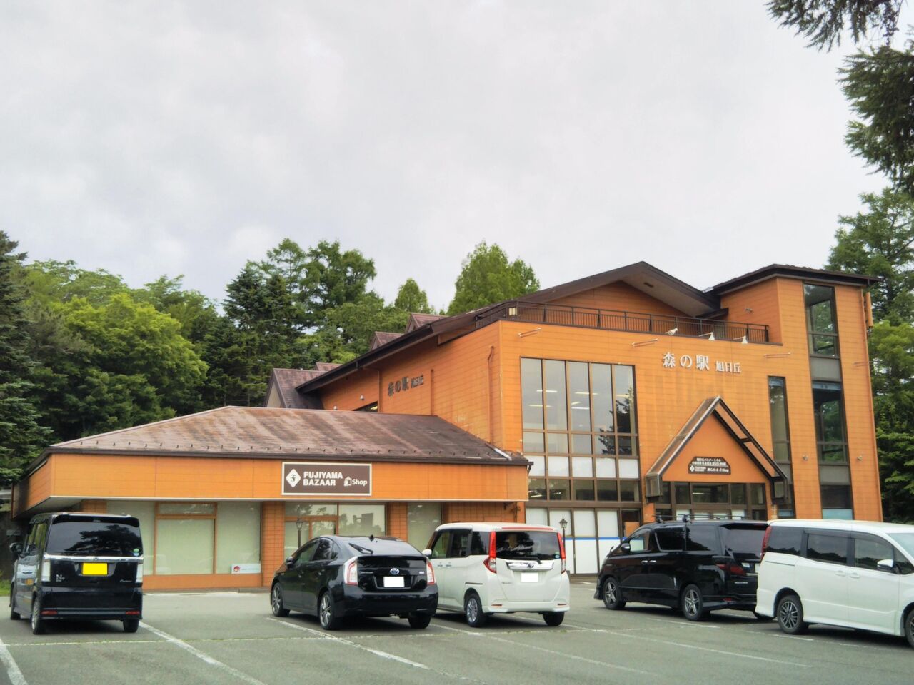 起点となる旭日丘バスターミナルが入る施設『森の駅旭日丘』の正面1階から見た建物全体と2階バスターミナル入口側から見た写真です。YAMANAKAKO NO KABAは右側写真の建物左側(富士山の下あたり)に発着します。