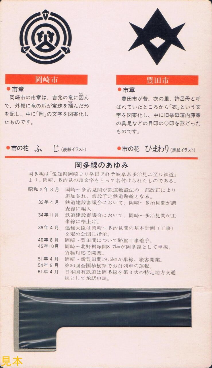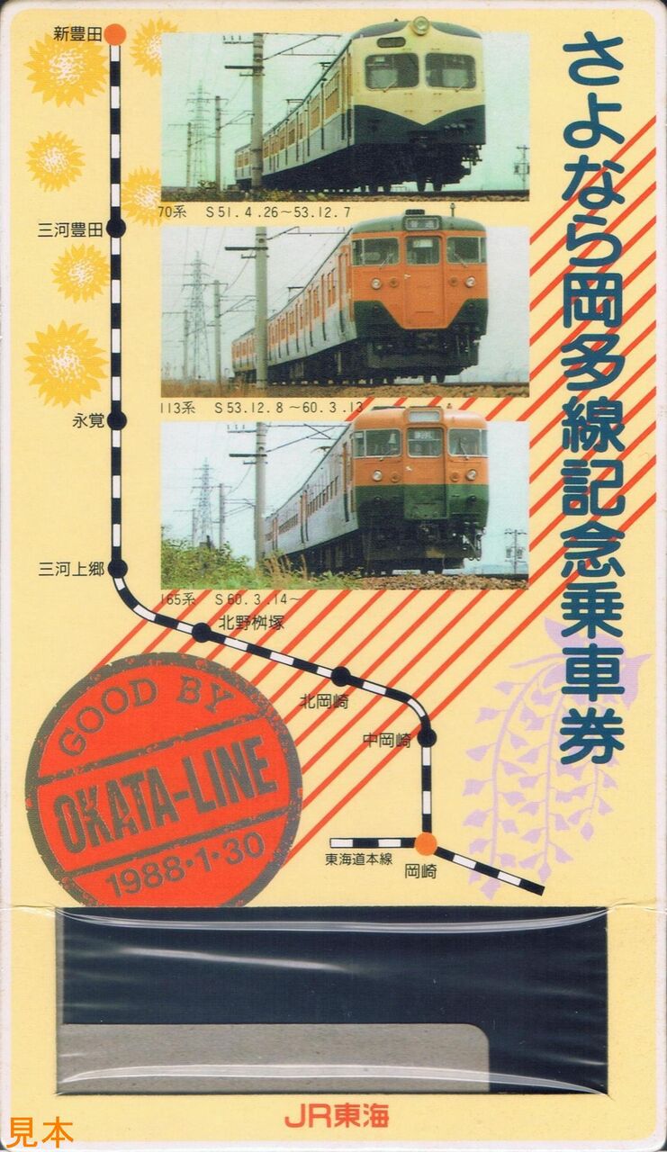JR東海岡多線(岡崎〜新豊田間)の廃止を記念して発売。台紙(写真左は表面、右は裏面)とD型硬券往復乗車券1枚のセット。台紙表面には歴代の使用車両。裏面には岡多線のあゆみと沿線の市章をデザイン。