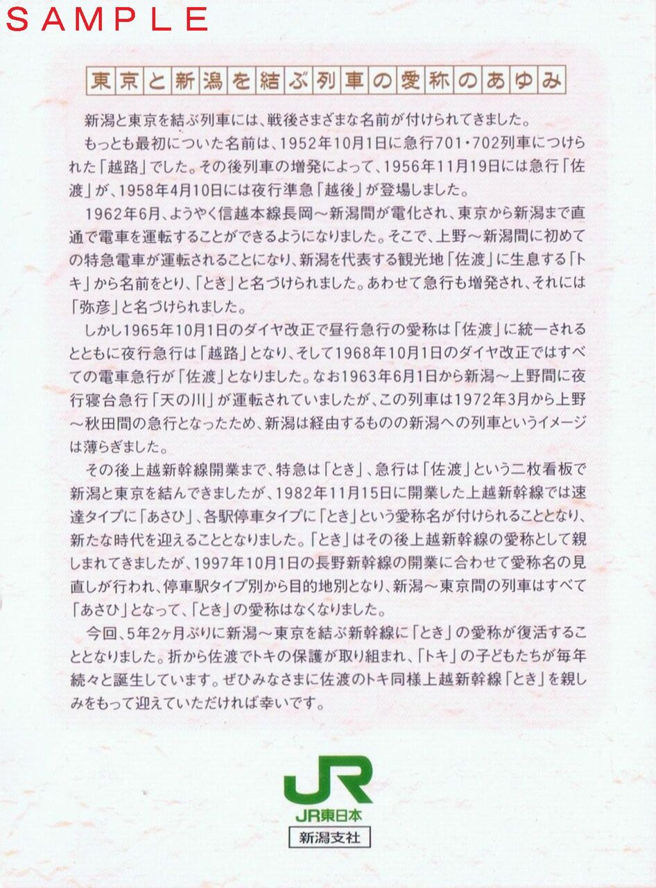 同年12月ダイヤ改正で『とき』の愛称が復活したことを記念して台紙(写真左はその表面。右は裏面)とオレンジカード3枚セットで発売されました。台紙表面デザインは在来線特急・とき号のヘッドマーク、新幹線・とき号の方向幕、新幹線・Maxとき号に使用されるE4系電車。