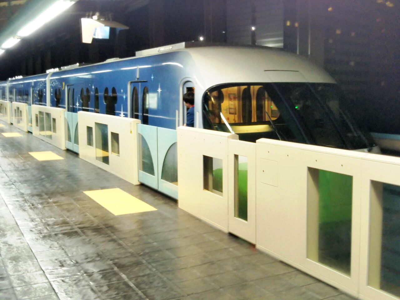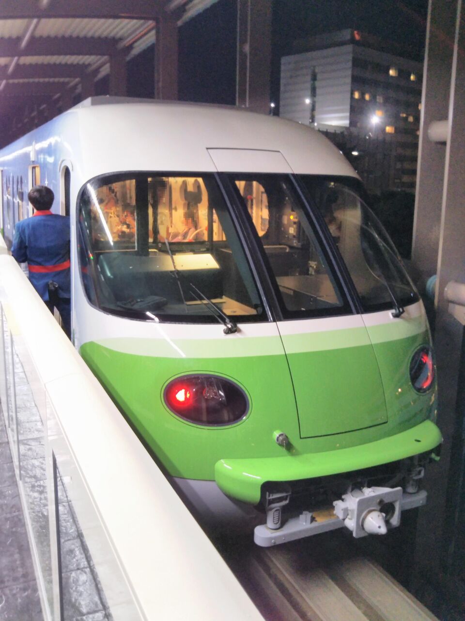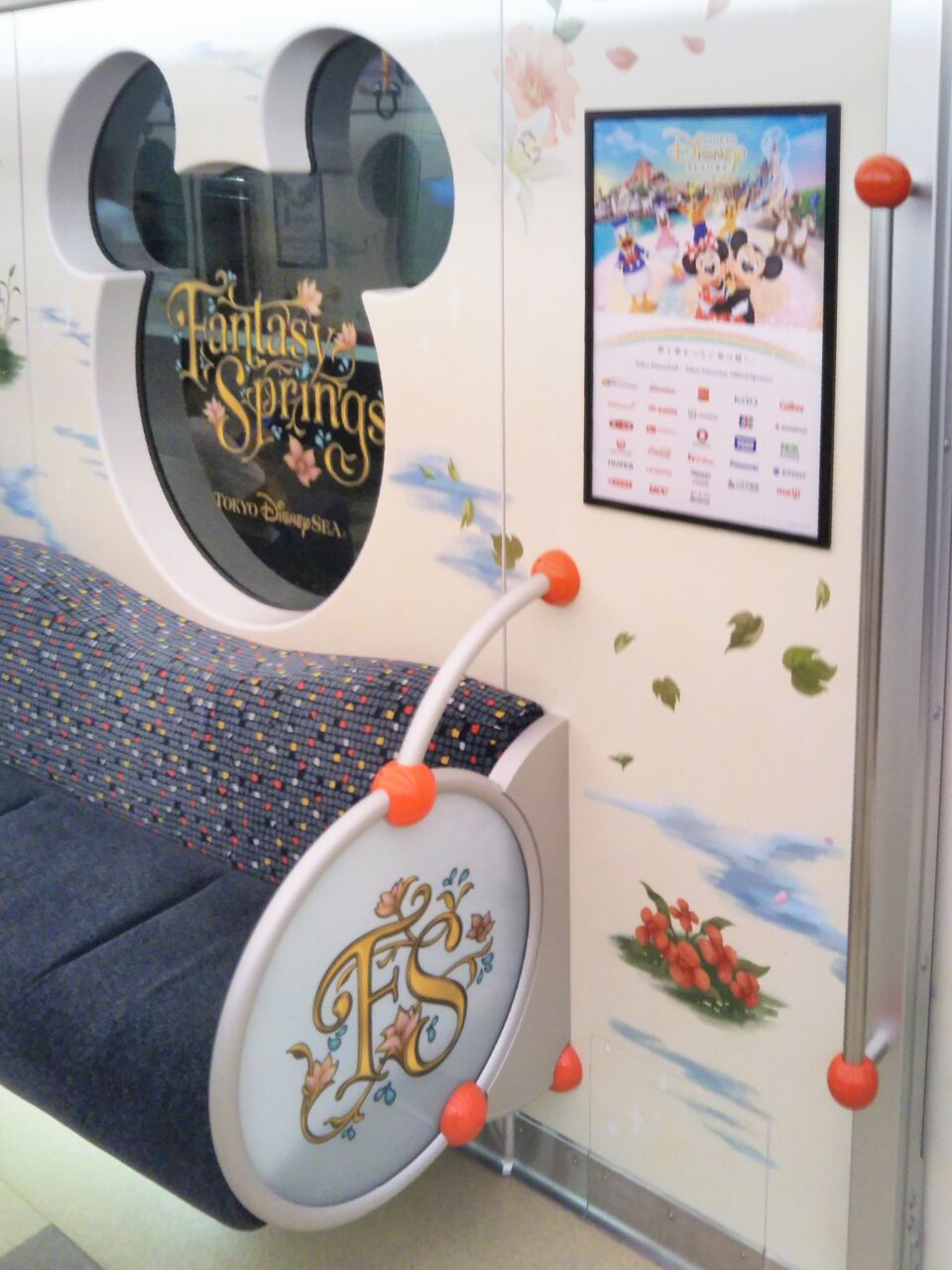 リゾートライナー(Type C)(グリーン)の側面がラッピングされ、"ファンタジースプリングス"ライナーとして運行しています。今回はホーム上からと車内のみの撮影です。