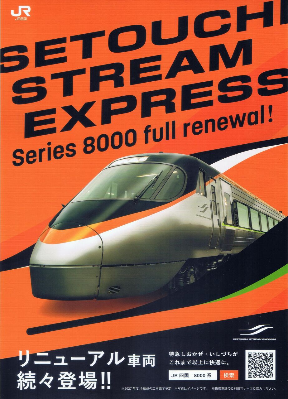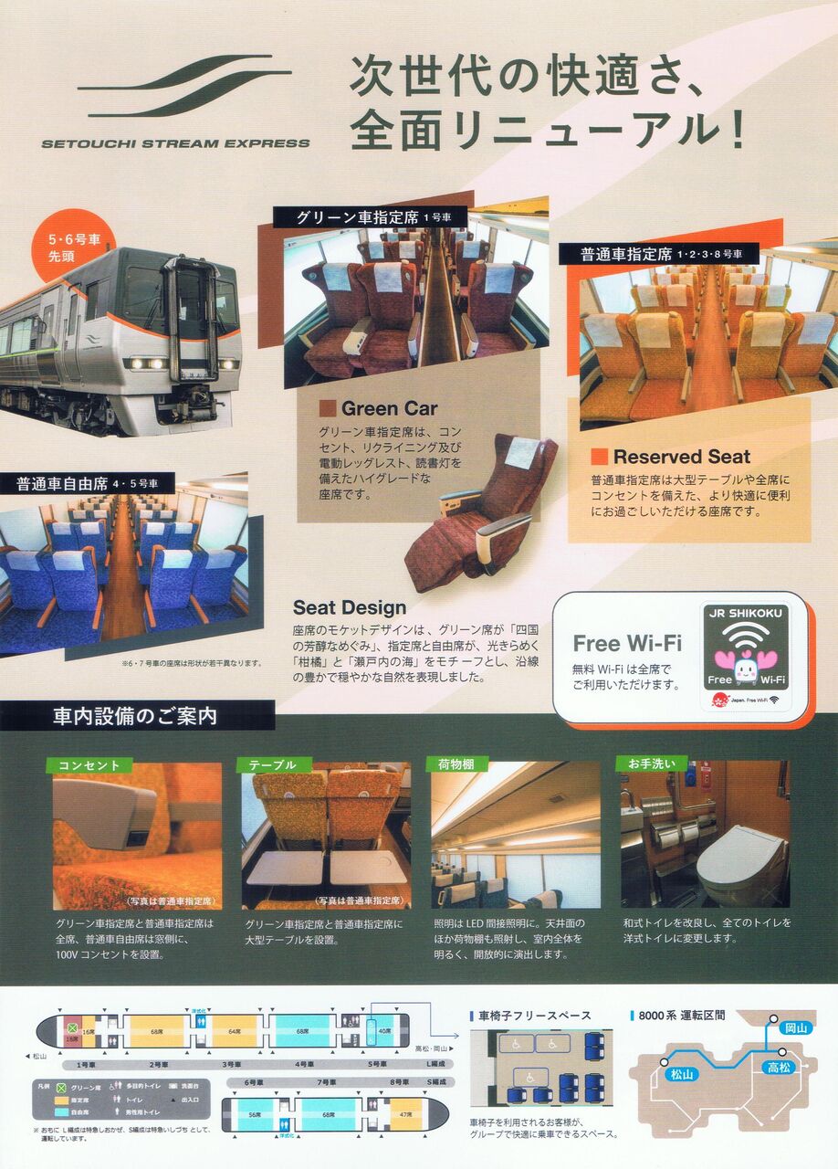 特急しおかぜ号、いしづち号に使用される8000系電車リニューアルに関するA4サイズ・両面印刷のリーフレットです。――――――――――――――――――――――――――――――――――――――