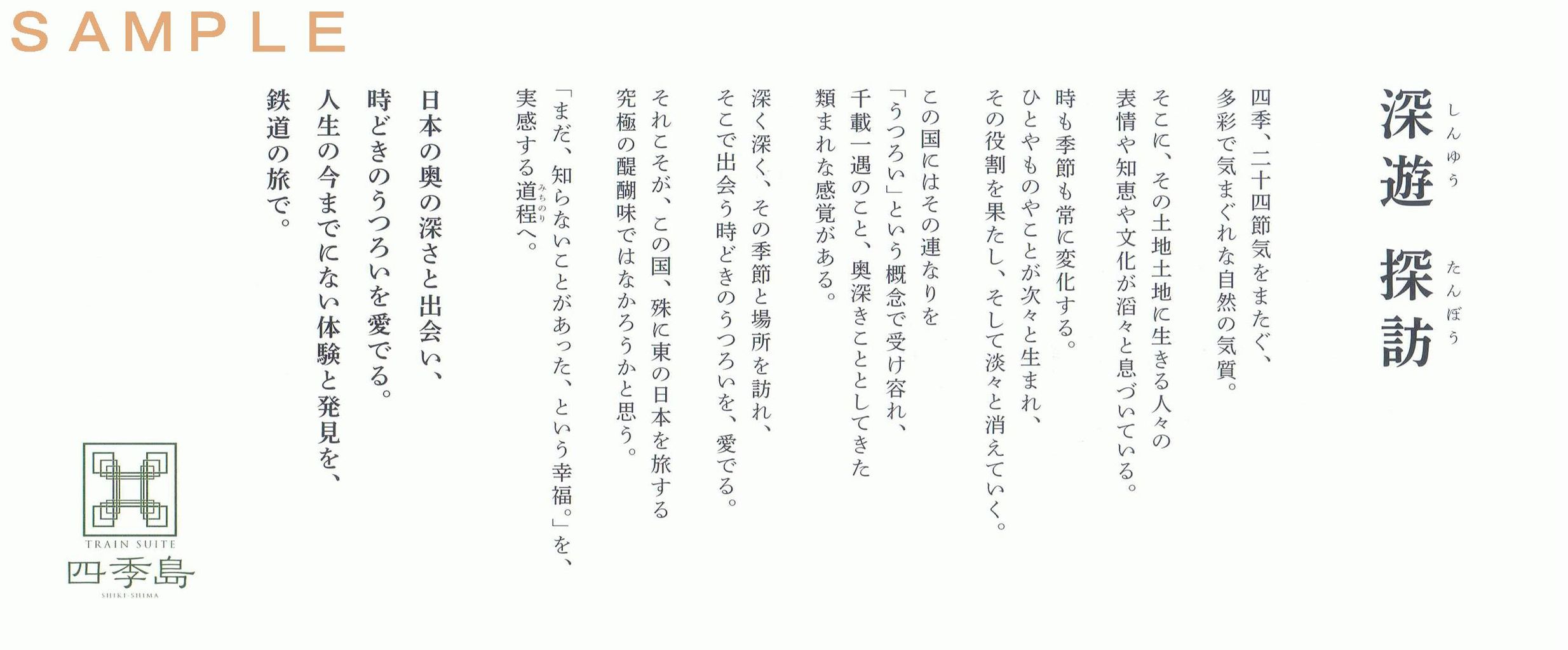 オンラインショップのページにある写真では全体の商品構成がいまいちよくわからないので、全種類を載せます。但し、偽造防止のため、画像は加工(実際はカラー印刷→白黒加工、ロゴは金色→黒塗りで隠す加工、SAMPLE表示を追加)しています。四季島に興味があるなら買っておいた方が良いです。