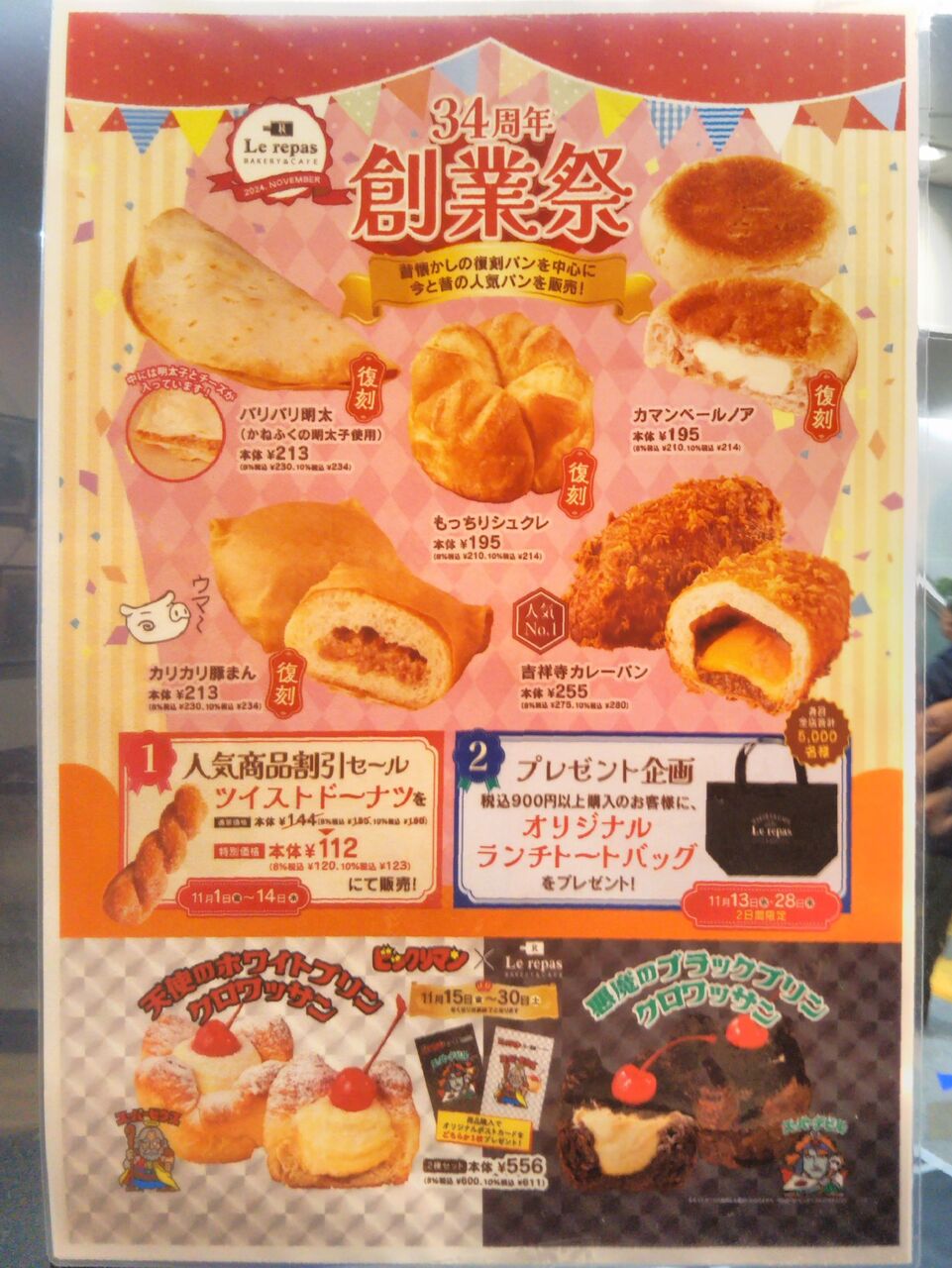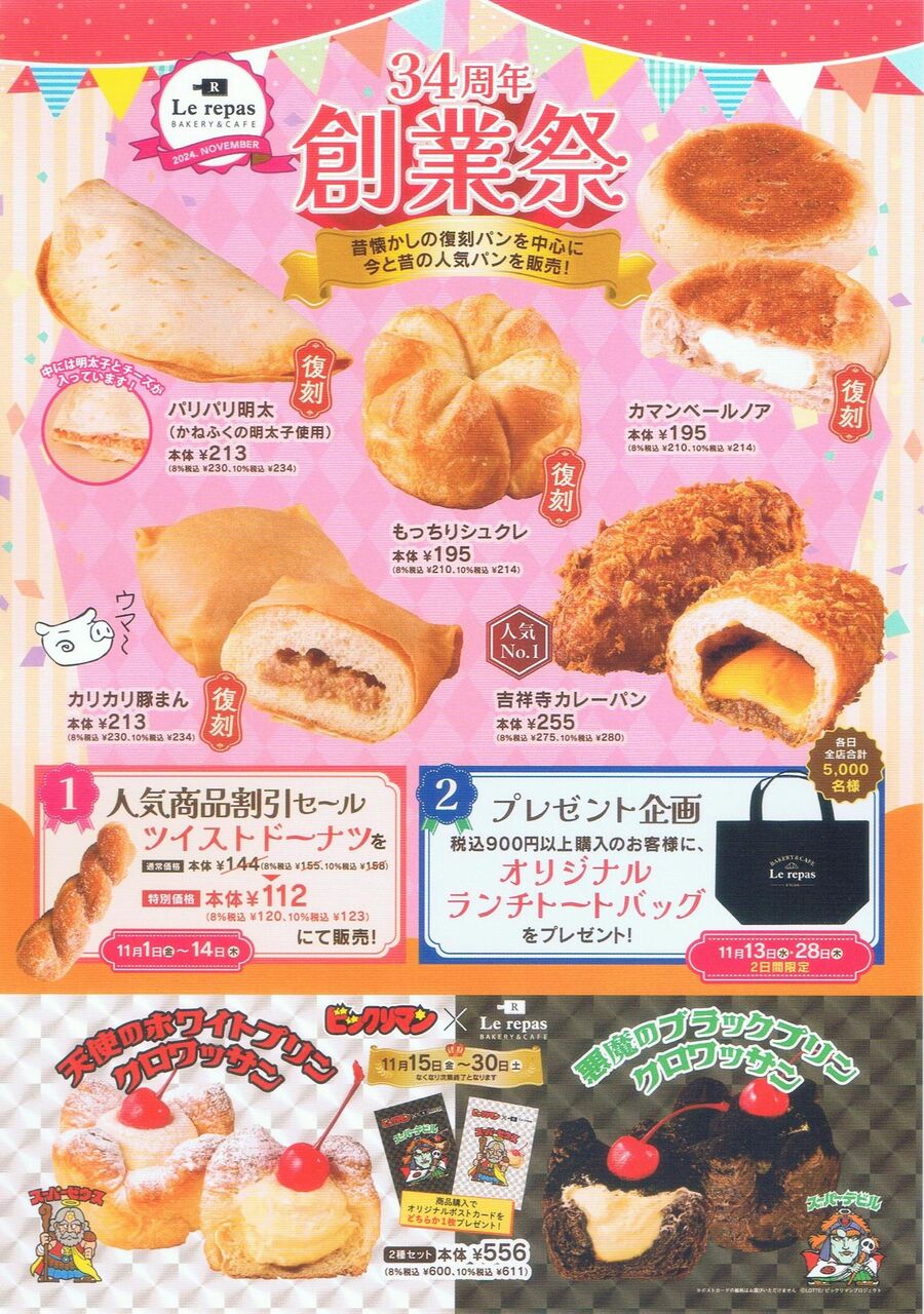 写真左はつつじヶ丘店で配布されていた当該商品を含む34周年創業祭のチラシです。写真右は調布店で購入した当該商品で、クロワッサン生地にクリームを入れ、更にカラメルを付けてプリン風に仕上げたパンです。かなり高カロリーそうですが、生地に絡んだカラメルでサクサク感が増してよい食感に。この2個で腹持ちがかなりよい。