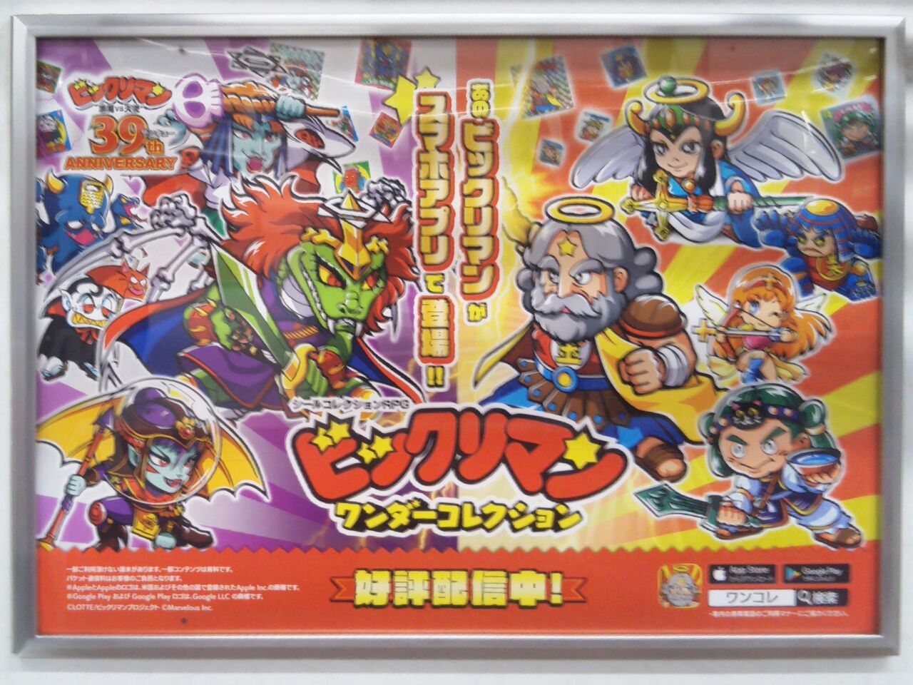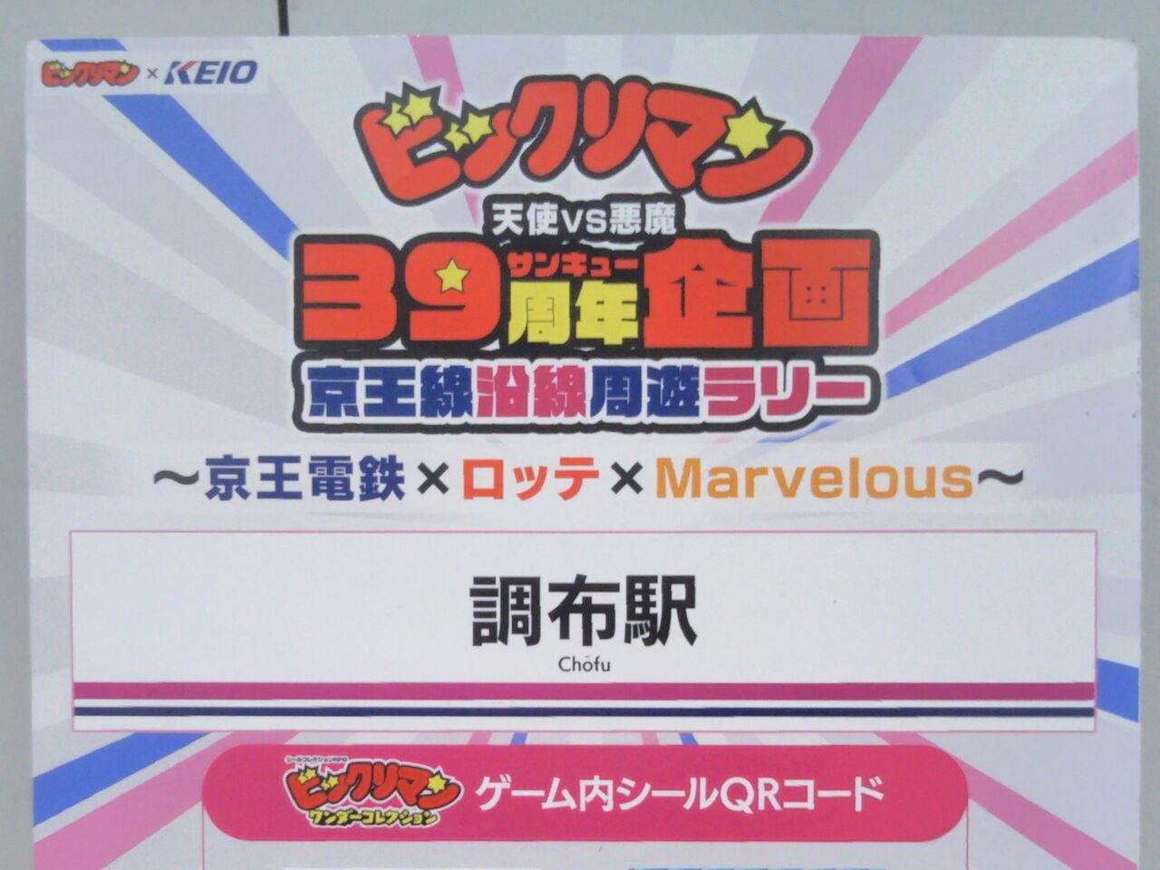 京王電鉄は株式会社ロッテおよび株式会社マーベラスとコラボレーションし、『ビックリマン悪魔 VS 天使 39(サンキュー)周年企画』を2024年(令和6年)11月15〜30日に実施しています。 ロッテのチョコレート菓子『ビックリマンチョコ』に封入されている『ビックリマンシール 悪魔 VS 天使シリーズ』の39周年を記念しています。企画内容は京王電鉄では記念乗車券の発売と9000系・1編成の車内ポスターをビックリマンのものに統一した『ビックリマントレイン』の運行を実施。その他、京王線内5駅に設置されたQRコードを読み込むことでマーベラスが運営するゲームアプリ『ビックリマン・ワンダーコレクション』でデジタルシールが貰える『京王線沿線周遊ラリー』の開催、京王食品が運営するベーカリーショップ・ルパでのコラボパン発売を行っています。