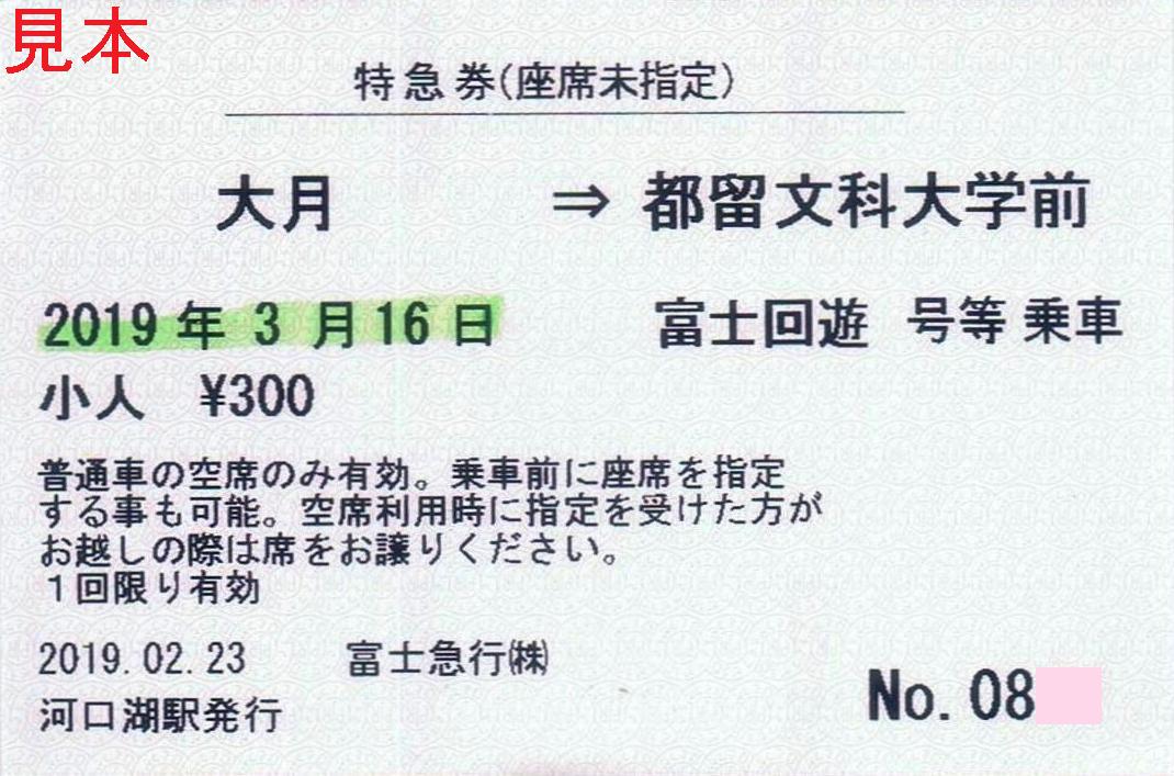 2019年3月ダイヤ改正より運行開始した特急富士回遊の富士急行線駅発行の特急券(座席未指定)です。運行開始初日分ですがダイヤ改正前に購入しています。