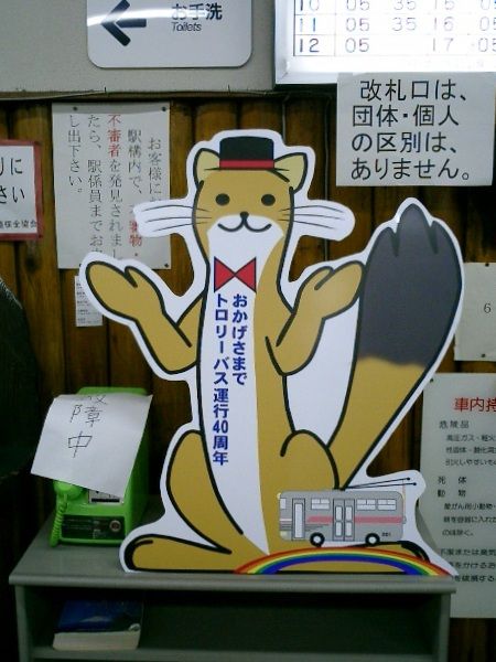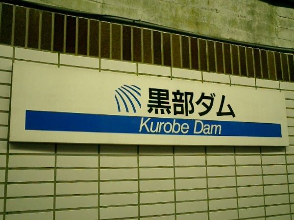 2点とも黒部ダム駅で撮影。左は駅名標。右はトロリーバス運行40周年記念キャラクター。夏休み期間中でかなり混んでいたので他の写真は撮っていません。《平成17年11月13日撮影》
