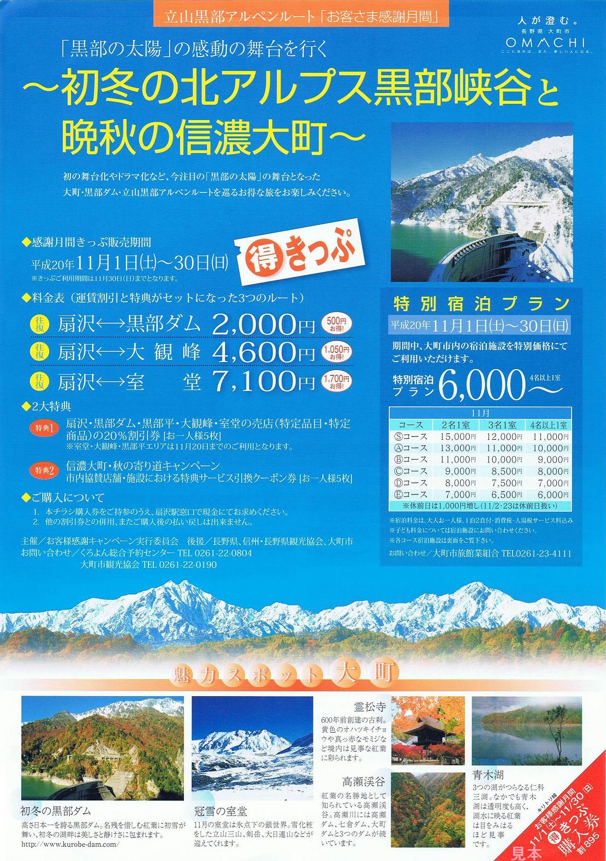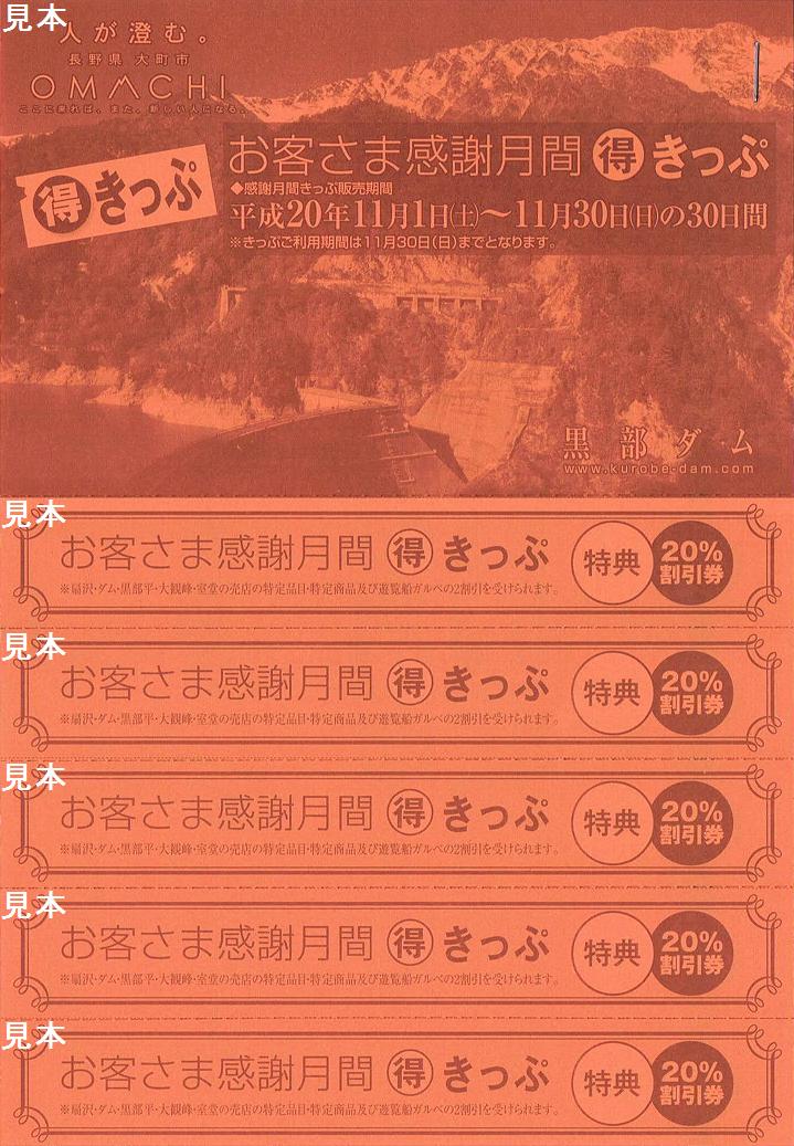 平成20年11月の閑散期をお客様感謝月間とし、扇沢〜黒部ダム・大観峰・室堂間の往復料金の割引と、扇沢・黒部ダム・黒部平・大観峰・室堂の売店で特定品目の割引券が貰えるもの。写真左は、道の駅ぽかぽかランド美麻等の周辺道の駅で配布されていたパンフレットで、お客さま感謝月間○得きっぷ購入券となっています。