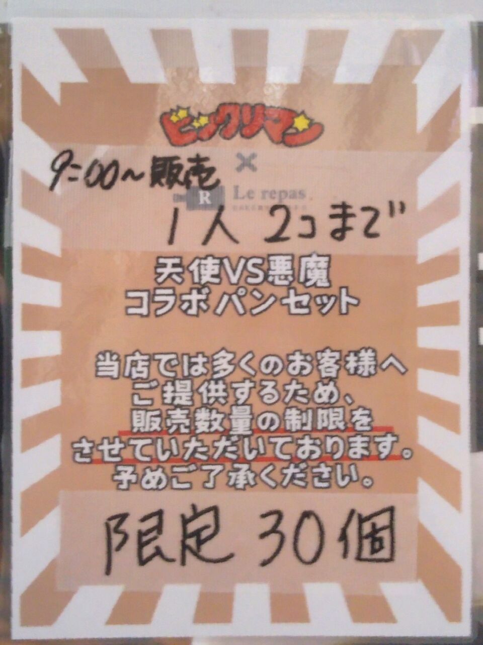先の写真と同日に撮影した調布店の掲示物。同店は凄く売れる日は1時間で完売するということ。確実に購入したければつつじヶ丘店や高幡不動店あたりがよいと思います。======================================