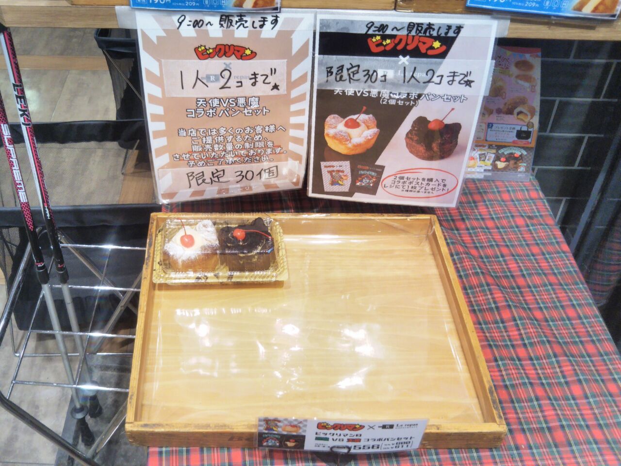 店舗によっては早い時間で売り切れることも多く、写真は2024年11月23日の10時前に撮影した調布店の当該商品販売状況。調布については普段から早々と売り切れる傾向がありますが、同日は真横でゲゲゲ忌2024を記念したキーホルダーの販売とスタンプラリー台紙等の配布が行われており、地下通路を埋め尽くすほどの混雑状況でしたが、それらに並んでいた人(私もそうです。キーホルダー購入とスタンプラリー台紙の入手まで1時間程度掛かった)が入手後にルパで一旦休憩し、スタンプラリーに参戦するという流れが出来ており、ゲゲゲ忌参加者のビックリマンコラボパン購入も見られました。