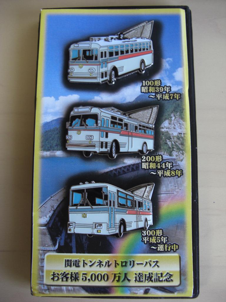 関電トンネルトロリーバス30周年を記念して出版。税別1,340円。写真左は帯が付いた状態の表紙。写真右は帯なしの表紙。なお、関電トンネルトロリーバス以外の既に廃止されたトロリーバスについても掲載されています。《関電トンネルトロリーバスお客様5,000万人達成記念ピンバッジ(平成20年11月23日収集)》