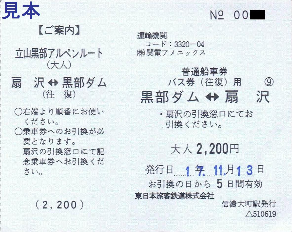 関西電力関電トンネルトロリーバス黒部ダム駅窓口で販売されている扇沢線の船車券(立山黒部アルペンルート普通船車券)。扇沢駅前から大町温泉か大町駅前までの大小4種類として販売。地紋は黄色の関電アメニックス社章。いずれも作り置きしてあり、着駅や小児の文字は全てスタンプであるという点は平成17年収集分と変わらず。運行事業者の変更に伴い、券上部に記載の『松本電鉄』に線が引かれている点だけが変わったところです。なお、今回は最安の券(扇沢―大町温泉の小児用500円)のみ購入しましたが、券番は平成17年購入時のものから十数番しか進んでいません。