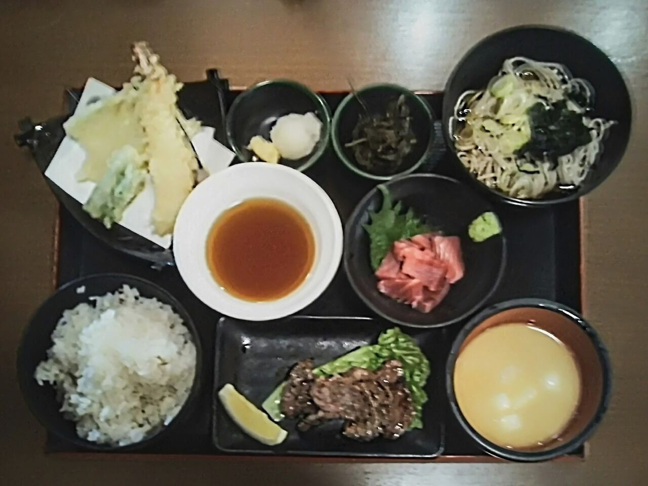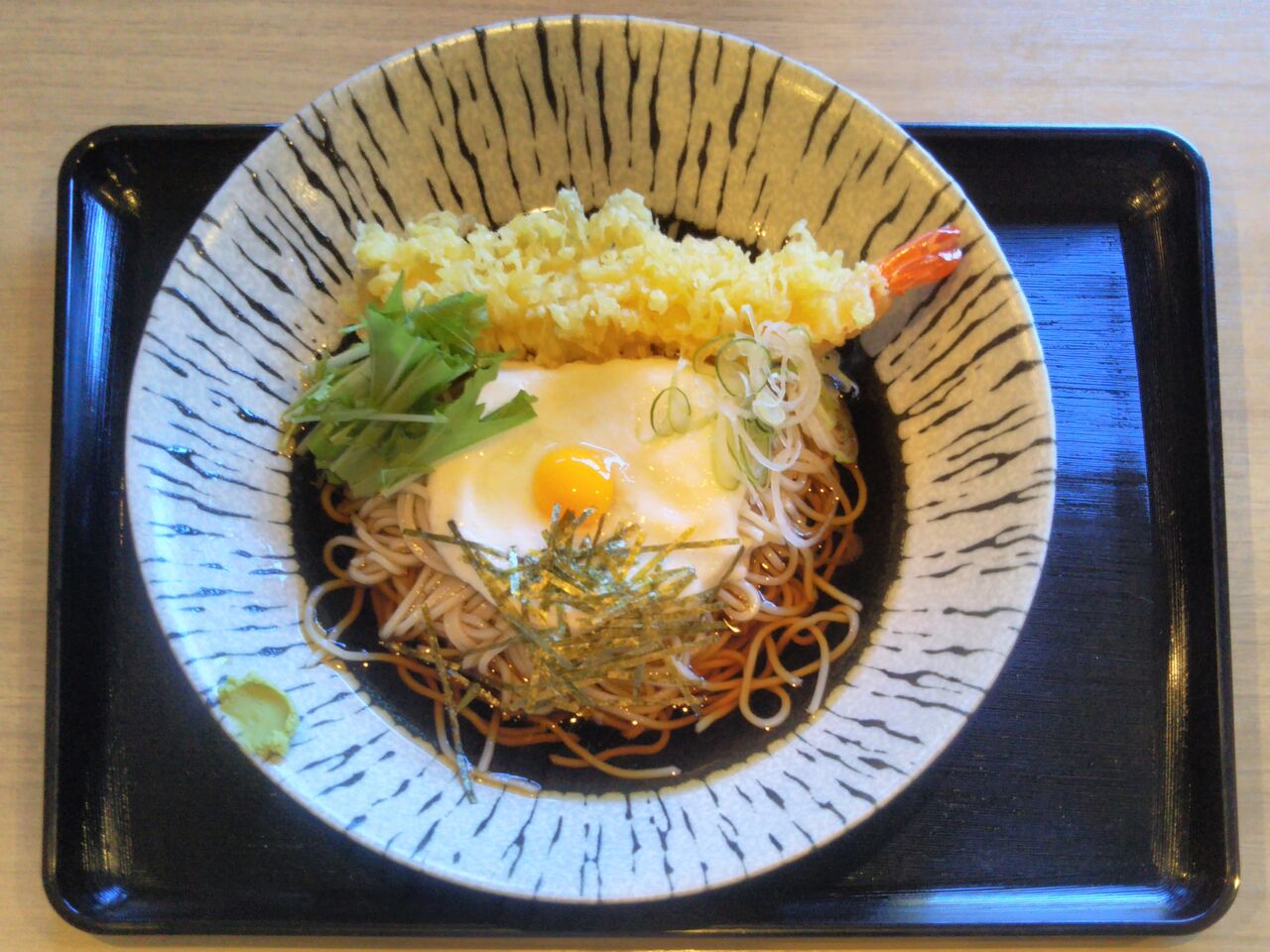 昼食時に訪問。今回は私も妻も『冷やし天ぷらとろろそば』(税込1,590円。割引クーポン利用で更に100円引き)にしました。濃い目のつゆと天ぷらが美味しいです。