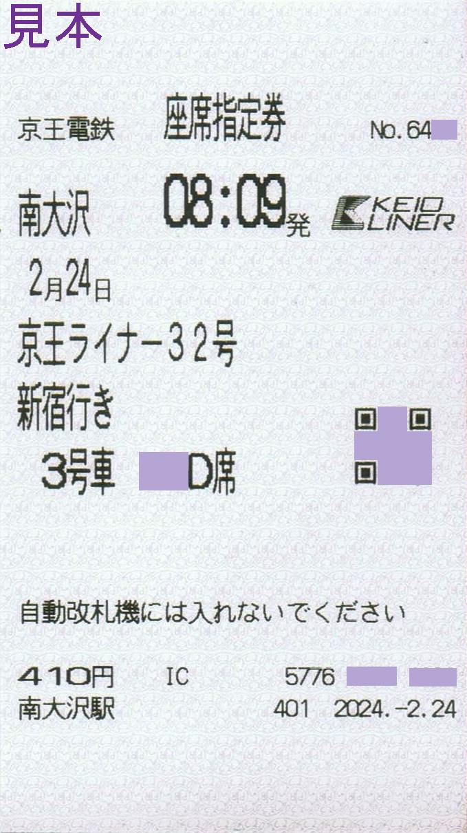 【高尾山冬そば号・京王ライナー32号の座席指定券(2024年2月24日)】