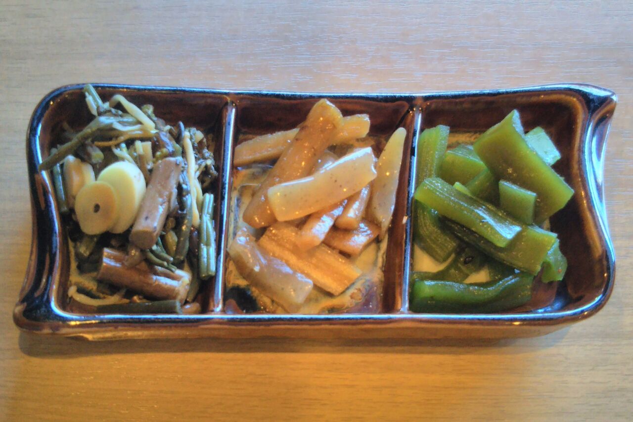 別皿の『山菜つまみ』(税込500円)と『手作り蕎麦茶ぷりん』(税込350円)も注文しました。ぷりんそのものは甘さ控えめで豆腐の様な食感。豆のシロップ漬けが甘みのアクセントになっています。