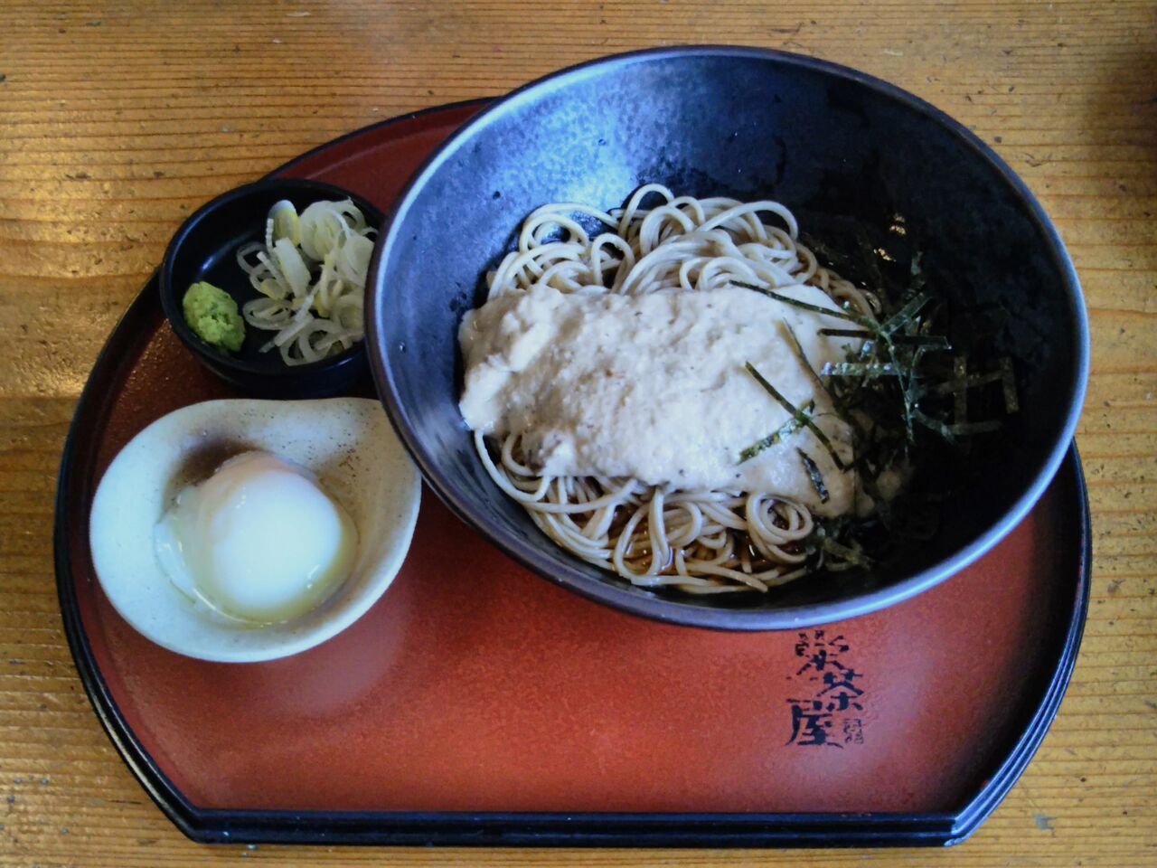 2016年訪問時にみられた天狗の耳たぶそば(※下記リンク記事『高尾山冬そば号(高尾山トレイン)』に掲載)は終売となっており、現在の主力商品は自然薯そば(写真のそばは『冷』で税込1,380円+温泉たまご・税込150円をトッピングしたもの)です。高尾山冬そばキャンペーンチラシの割引クーポンで100円引となります。