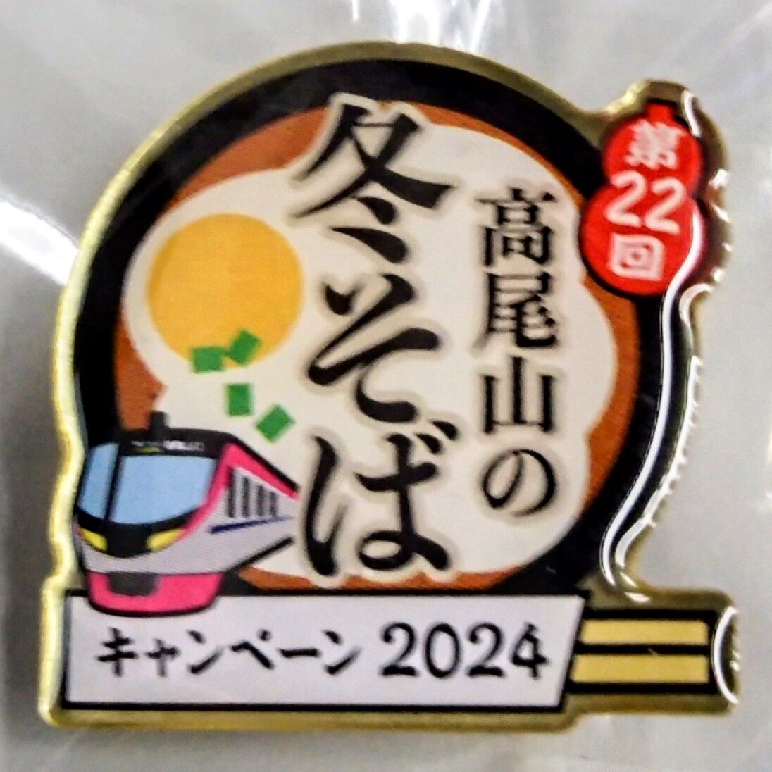 第23回・高尾山の冬そばキャンペーンでは、そば店を2回廻り、500円以上のそば・うどんを食べた者の先着2,000名に写真のピンバッジがプレゼントされます。交換場所は高尾山口観光案内所。デザインは高尾山冬そば号(Mt.TAKAO1号)に使用される5000系と条件は前年と同じです。