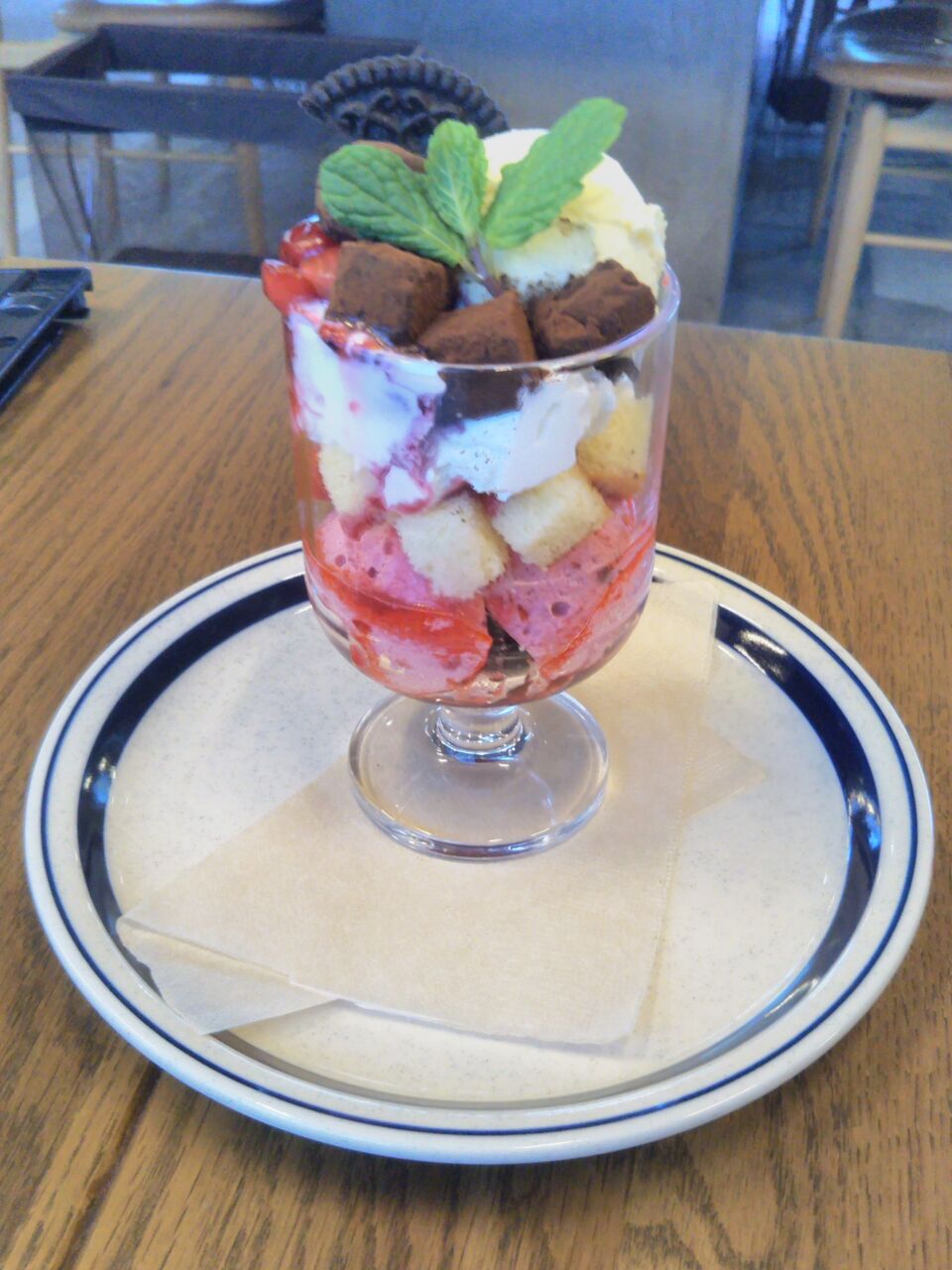 写真は期間限定商品の『ベリーアンドクッキーサンデー』(税込750円)。こちらはホイップクリームにマスカルポーネチーズを使用。以前は高尾山温泉に『濃厚抹茶プリンと黒ごまジェラートパフェ』という割と本格的なパフェがありました(下記リンク記事『京王電鉄 高尾山冬そば号(高尾山トレイン)』の2016年訪問記に写真あり)が、今では販売しておりません。期間限定とはせずに何時でも高尾山口駅周辺でパフェが食べられる店であって欲しいと思いました。