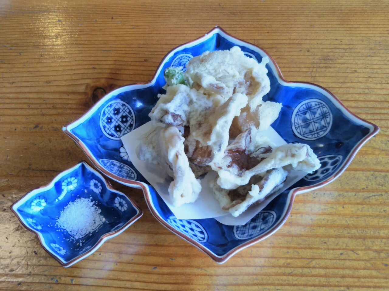 先述の通り、そばとしては終売となりましたが、天狗の耳たぶ天ぷら(税込880円)がありました。私は半分を塩で、残りを温かいそばに入れて食べました。