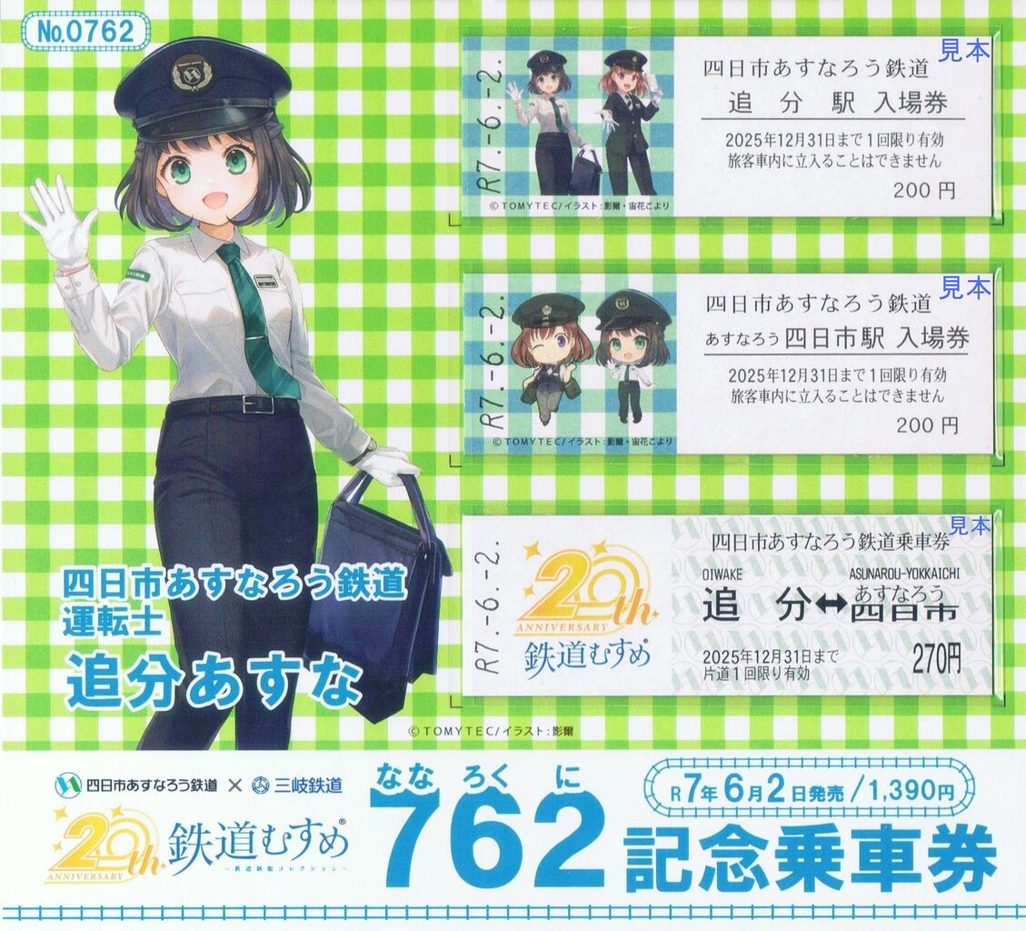 北勢線の軌間762mmに因んだ令和7年6月2日と鉄道むすめ20周年を記念して四日市あすなろう鉄道と共同で発売した記念乗車券の三岐鉄道版。発売セット数は両社あわせて762セット。価格は両社分あわせて1,390円。――――――――――――――――――――――――――――――――――――――