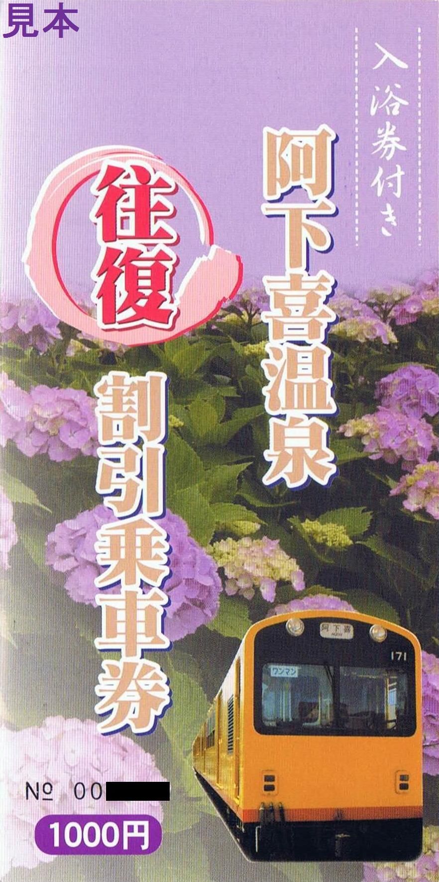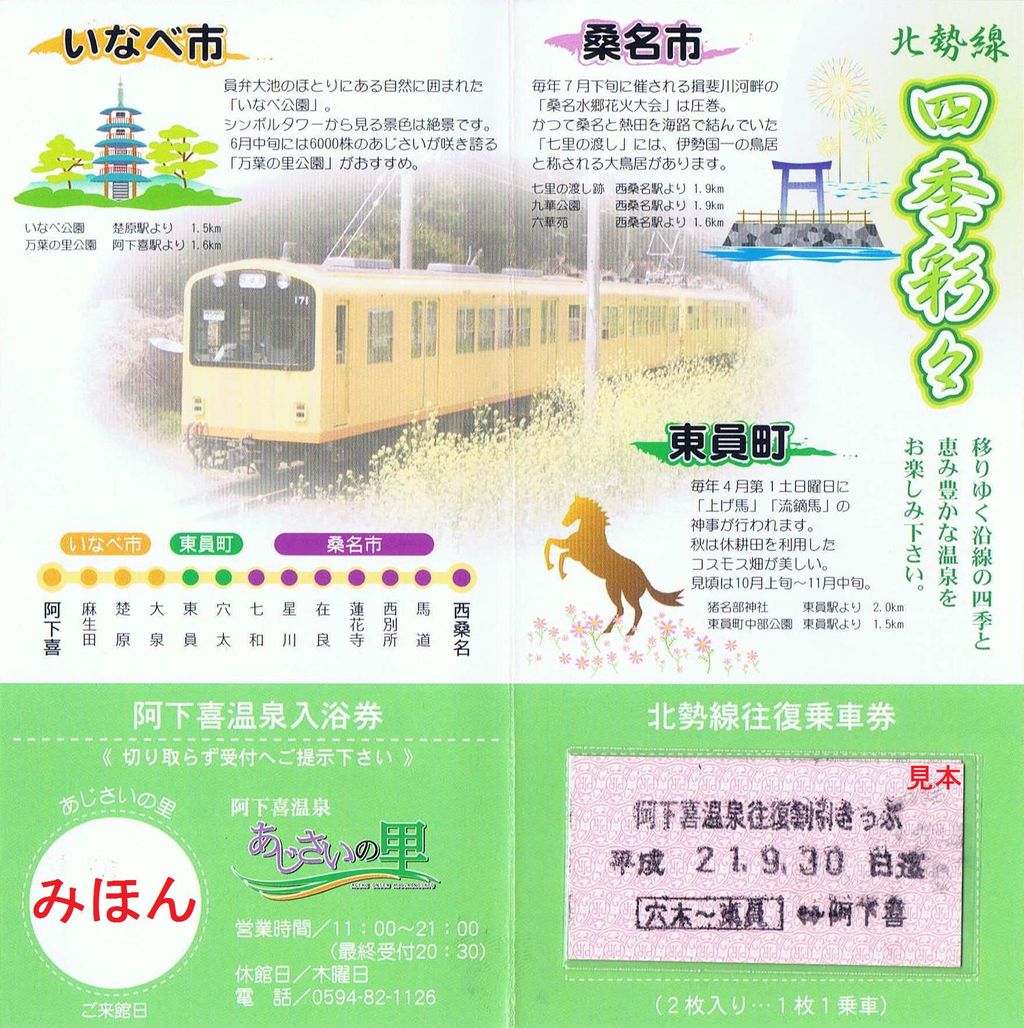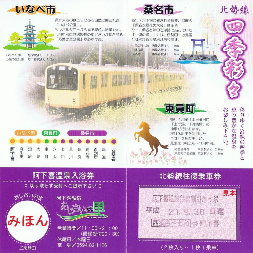 北勢線各駅から阿下喜駅までの往復割引乗車券と阿下喜駅近くにある阿下喜温泉『あじさいの里』をセットにしたもの。券の構成は入湯券を兼ねた台紙と往復乗車券(印刷ではなくスタンプで押印された磁気券)2枚。大人用のみの設定で西桑名〜七和間発が1,000円。穴太〜東員間発が800円。大泉〜麻生田間発が600円となっており、西桑名・星川・東員・楚原で発売。