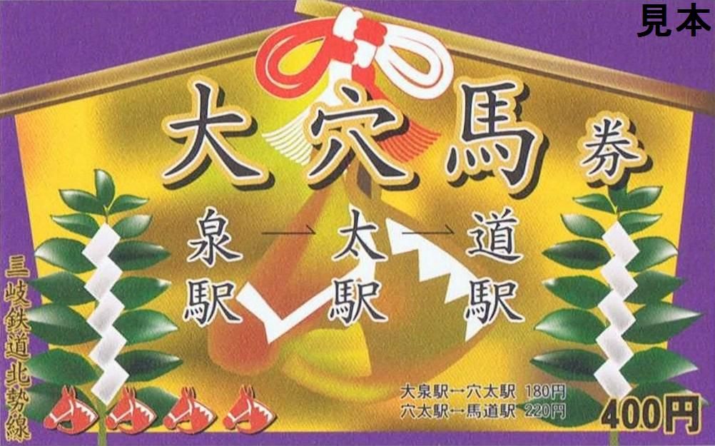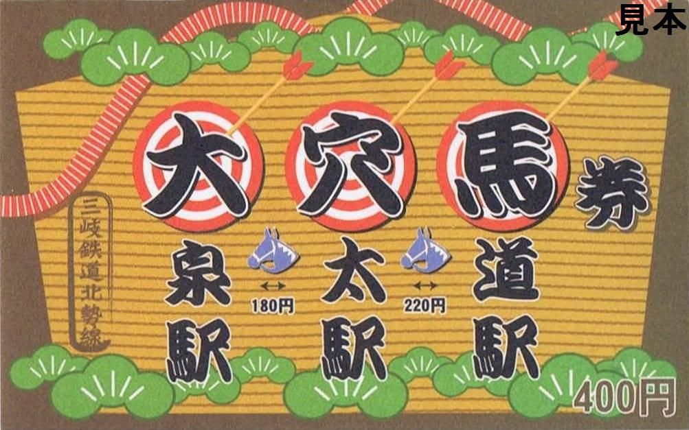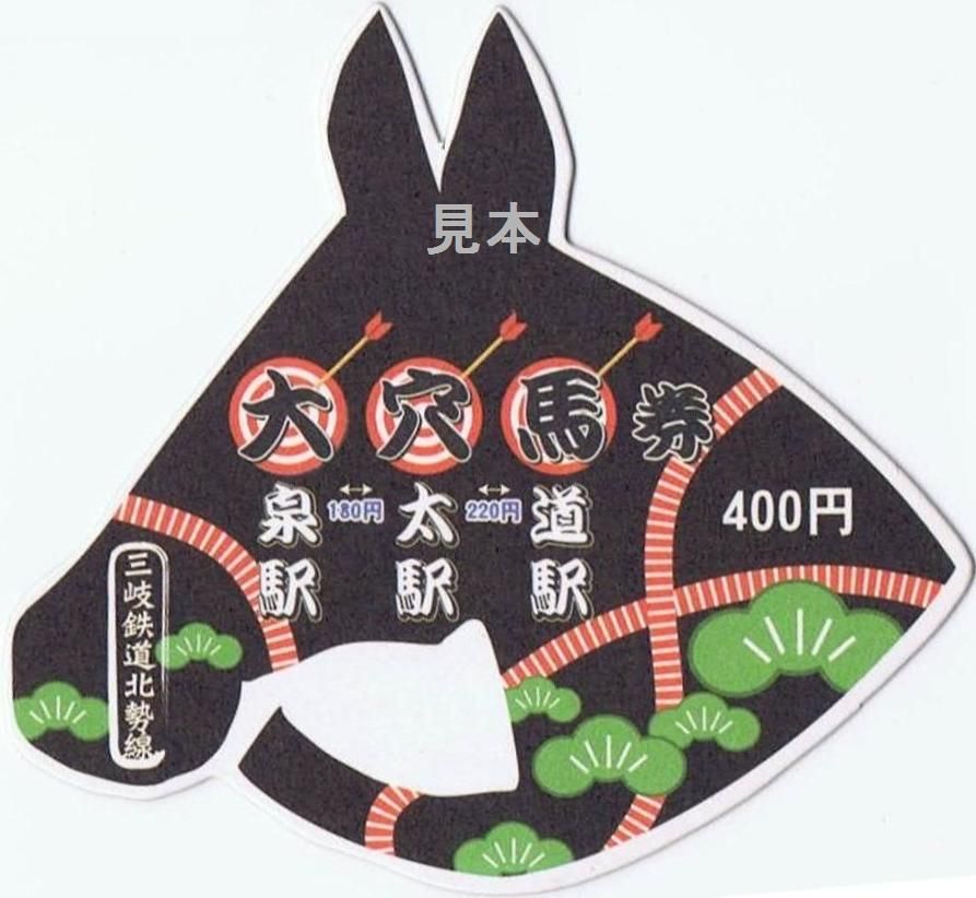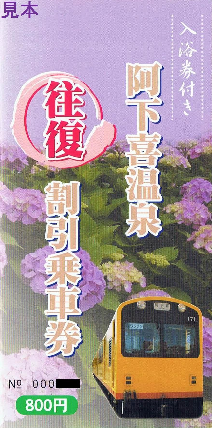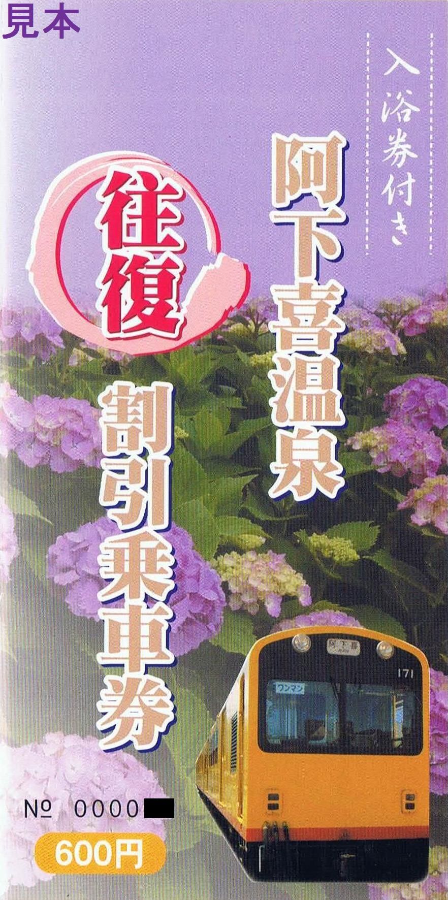 北勢線各駅から阿下喜駅までの往復割引乗車券と阿下喜駅近くにある阿下喜温泉『あじさいの里』をセットにしたもの。券の構成は入湯券を兼ねた台紙と往復乗車券(印刷ではなくスタンプで押印された磁気券)2枚。大人用のみの設定で西桑名〜七和間発が1,000円。穴太〜東員間発が800円。大泉〜麻生田間発が600円となっており、西桑名・星川・東員・楚原で発売。