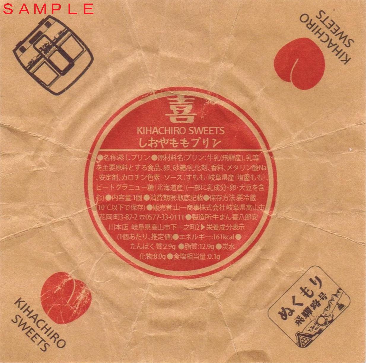 急行ぬくもり飛騨路号のヘッドマーク及びキハ85系デザインの掛紙が付いた蒸しプリン。販売者は同列車の車内販売を担当していた高山市の山一商事株式会社。製造所は牛まん喜八郎安川本店。
