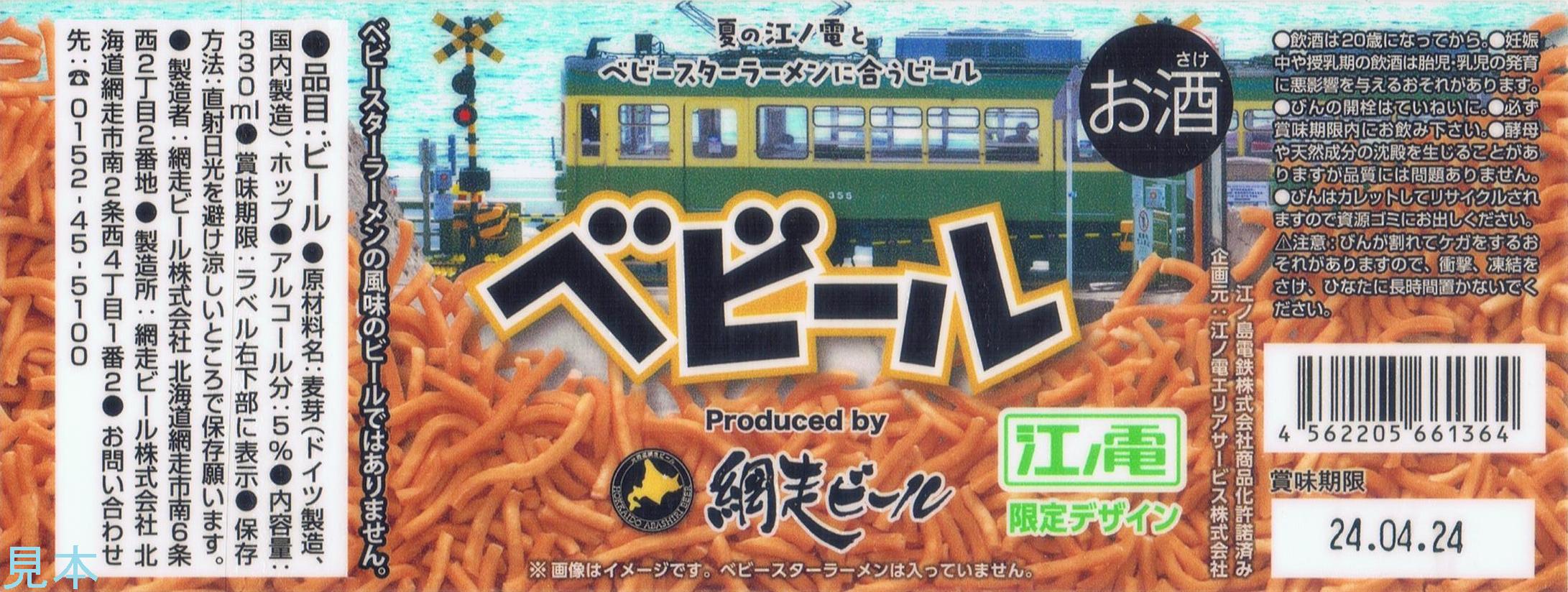 2022(令和4)年に網走ビール株式会社がベビースターラーメンにあうビールとして発売した『ベビール』の江ノ電限定デザインラベル版で、江ノ電エリアサービス店舗にて発売されました。税別700円。ラベルに書かれた注意書き『ベビースターラーメンは入っていません。』『ベビースターラーメンの風味のビールではありません。』が面白いです。【関連記事】