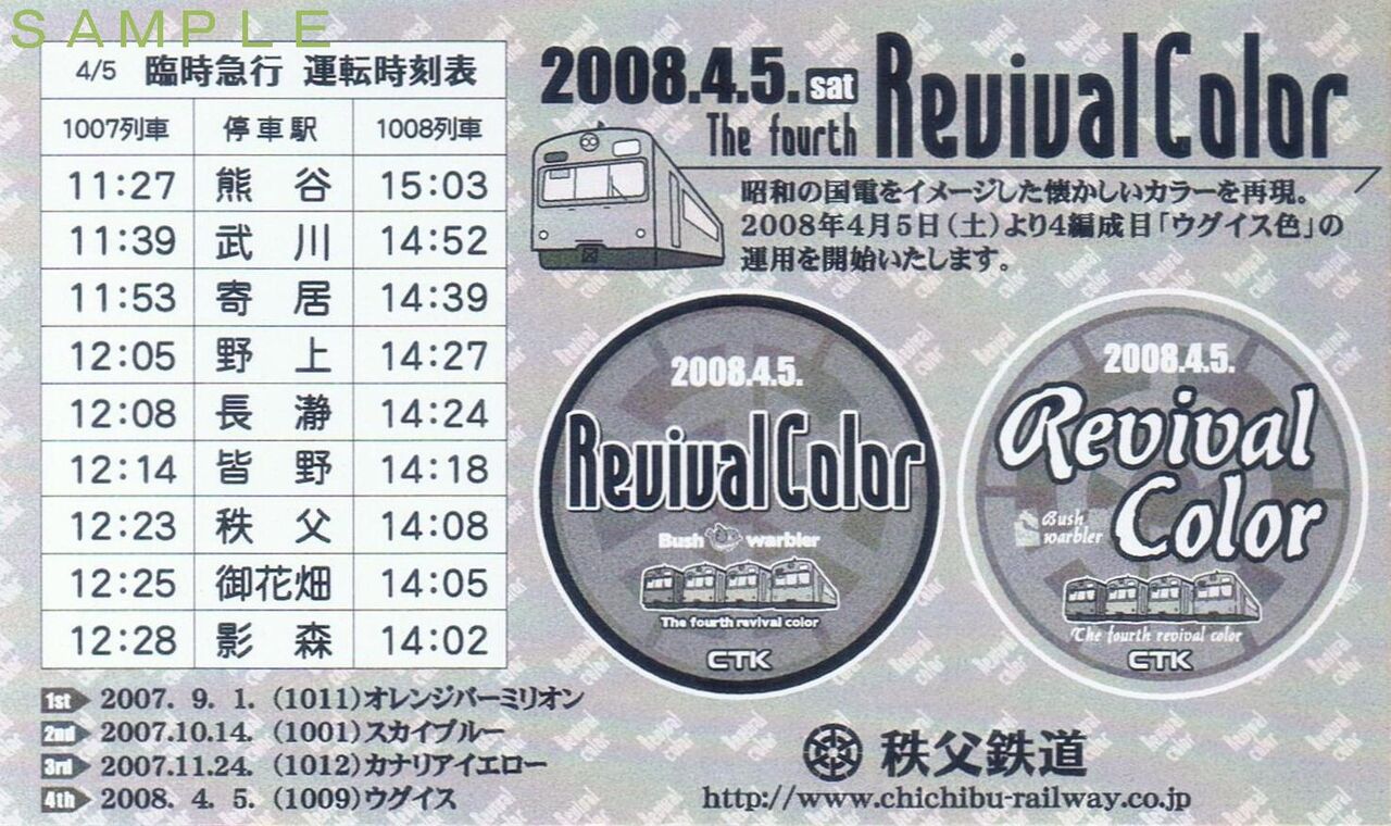 秩父鉄道は2008(平成20)年4月5日、昭和の国電をイメージした1000系電車(ウグイス色・関西本線塗装)の運行開始を記念して熊谷〜影森間にウグイス色臨時急行を運行しました。