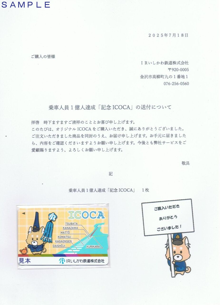 2015年3月14日の開業から10年3ヶ月を経過した2022(令和7)年6月22日に乗車人員1億人を達成したことを記念して発売された記念ICOCAで1枚2,000円(デポジット500円、SFチャージ1,500円含む)。第一販売期間は5,000枚限定発売。写真左はカード本体。写真右は送付のご案内で、これにビニール包装されたカード本体が付いていました。