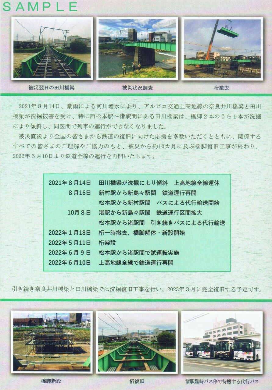 豪雨による橋梁洗掘被害により上高地線松本〜渚間が運休、バス代行となっていました。田川橋梁の橋脚復旧工事終了に伴う全線運転再開を記念してA型硬券乗車券2枚(松本から新島々、渚から松本)、A型硬券入場券(西松本駅、渚駅)、台紙をセットにした記念きっぷ。1セット1,250円。写真左は台紙表面、右は台紙裏面。【関連記事】