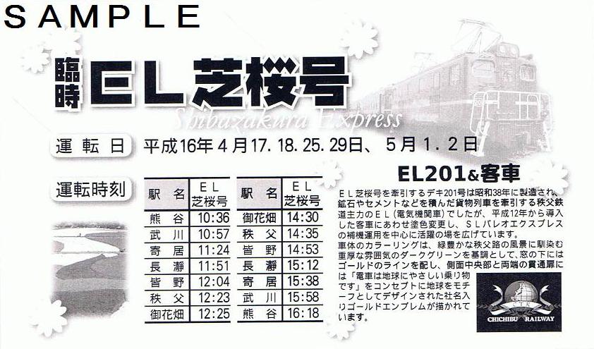 秩父鉄道のSL列車・パレオエクスプレス号は、平成16年の検査時にC58蒸気機関車が不調である事が判明した為、同年度の運行開始時期が遅くなりました。その代わりに4月と5月の計6日『EL芝桜号』が運行されましたが、電気機関車+客車の面白い組み合わせで好評だったと思われます。秩父鉄道の電気機関車は貨物列車の牽引がメインですが、休日にそれを有効活用するアイデアはなかなかのもの。