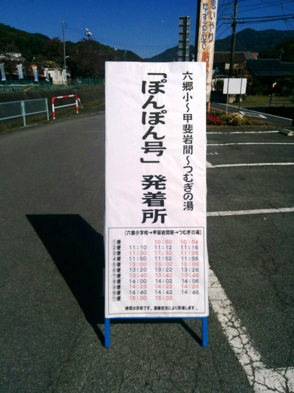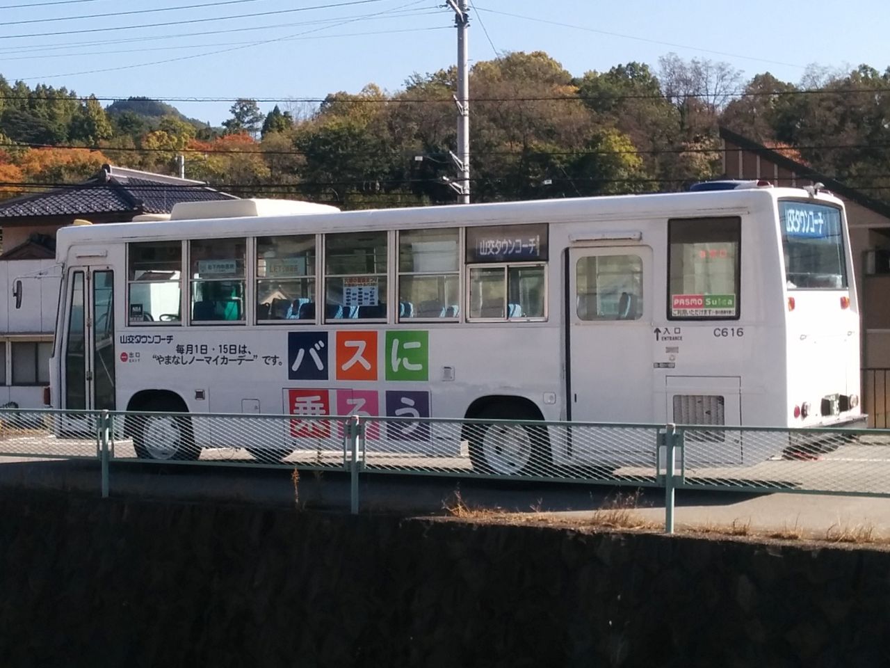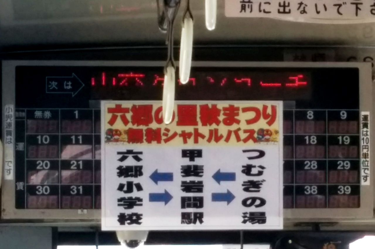 市川三郷町では2017年11月5日の『第11回六郷の里秋まつり』と身延線臨時急行列車『いちかわみさと号』の運行に合わせて、六郷小学校(祭り会場)〜甲斐岩間駅〜つむぎの湯間にシャトルバス「ぽんぽん」号を運行しました。運転は山交タウンコーチが担当してます。運賃は無料でした。