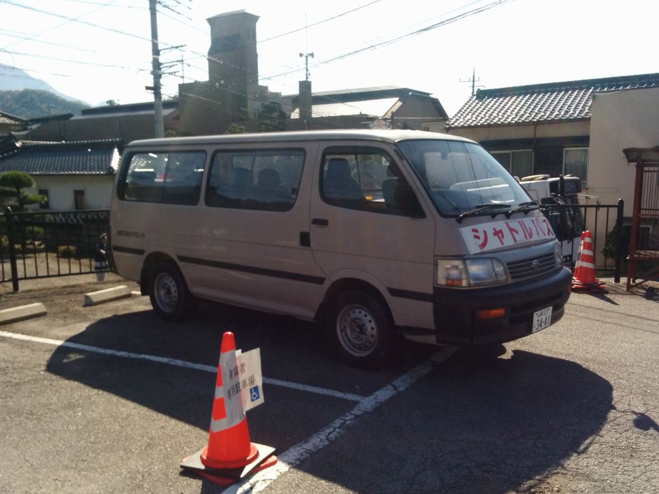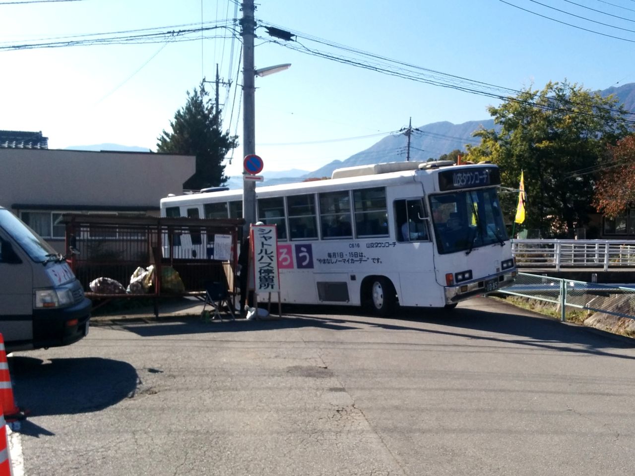 写真左は六郷小学校側から停留所を撮影したもの。写真右は六郷小学校(祭り会場)〜つむぎの湯間を直行するシャトルバスで、ワゴンによる運行。