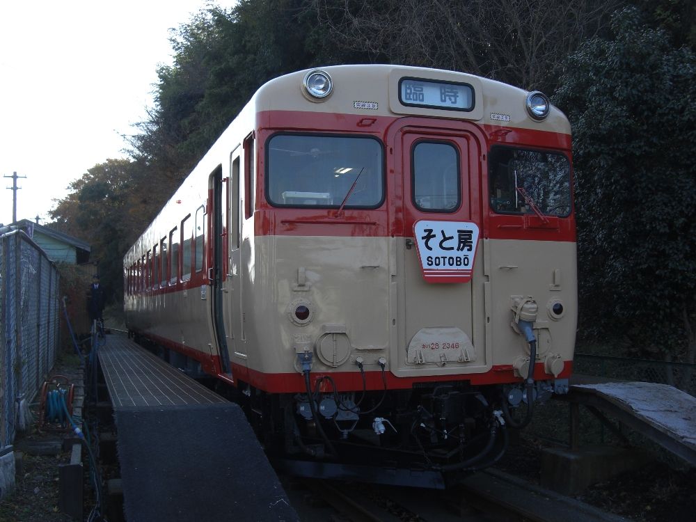 キハ28は千葉県営人車軌道100周年記念イベントとして大多喜駅構内に展示。未だ営業運転していませんが、車内が見学できました。『そと房』のヘッドマーク付き。