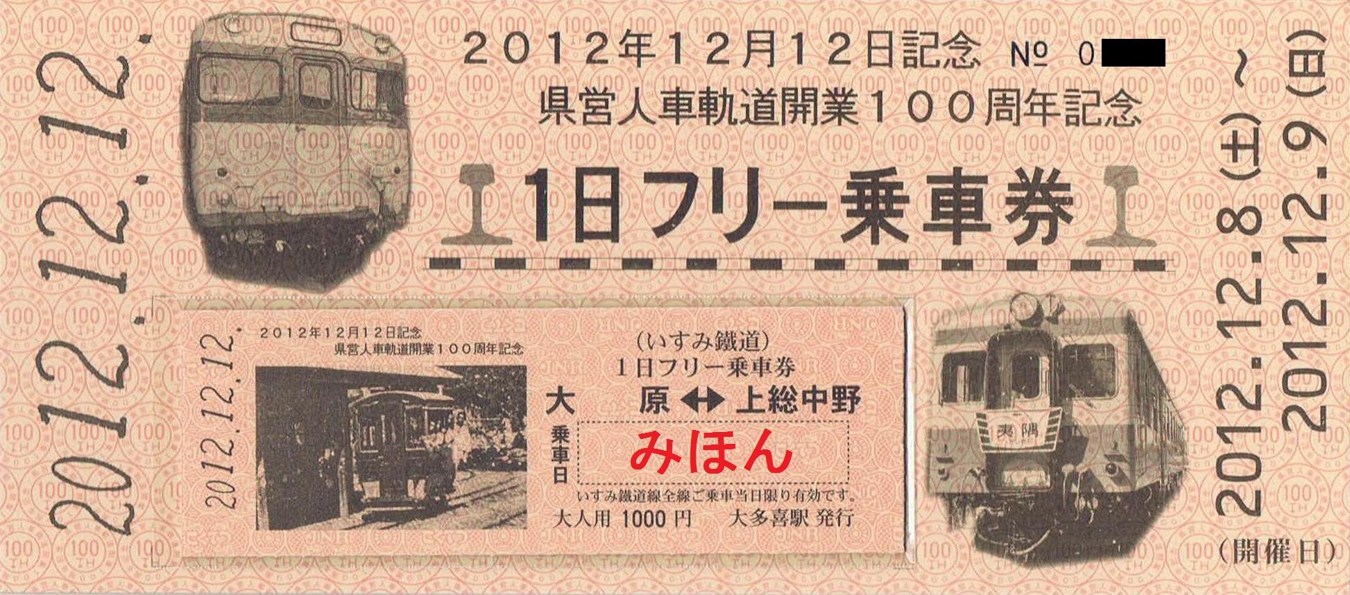 2012年12月12日の12並びといすみ鉄道の前身である県営人車軌道の開業100周年を記念して発売。D型硬券で今回は台紙も厚みのあるものになっています。デザインは乗車券に人車軌道、台紙にキハ52(『夷隅』のヘッドマーク付き)とキハ28を使用。======================================