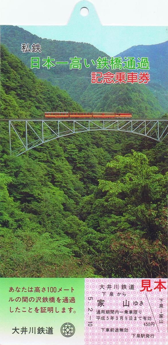 井川線の関の沢鉄橋通過を証明する記念乗車券。乗車券の区間は関の沢鉄橋とは関係のない大井川本線の下泉から家山ゆきとなっています。※平成22年3月31日掲載(私鉄日本一高い鉄橋通過記念乗車券)