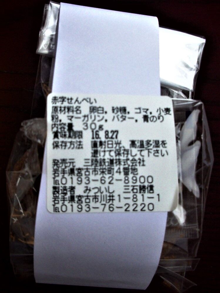 製造者は宮古市川井の『みついし』。本列車で販売する三陸鉄道デザインの商品としては最安の200円。ゴマや青のりの入った甘くて美味しいせんべい。